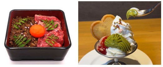 左/パワーフードの新作「#肉といえば松田」の『和牛すき焼き重』¥2,400。右/ひんやり夏味スイーツも続々。「JULIAN●(※1)SUCRE(※2)●(※1)ACID」の『ピスタチオのパーティ』¥1,380