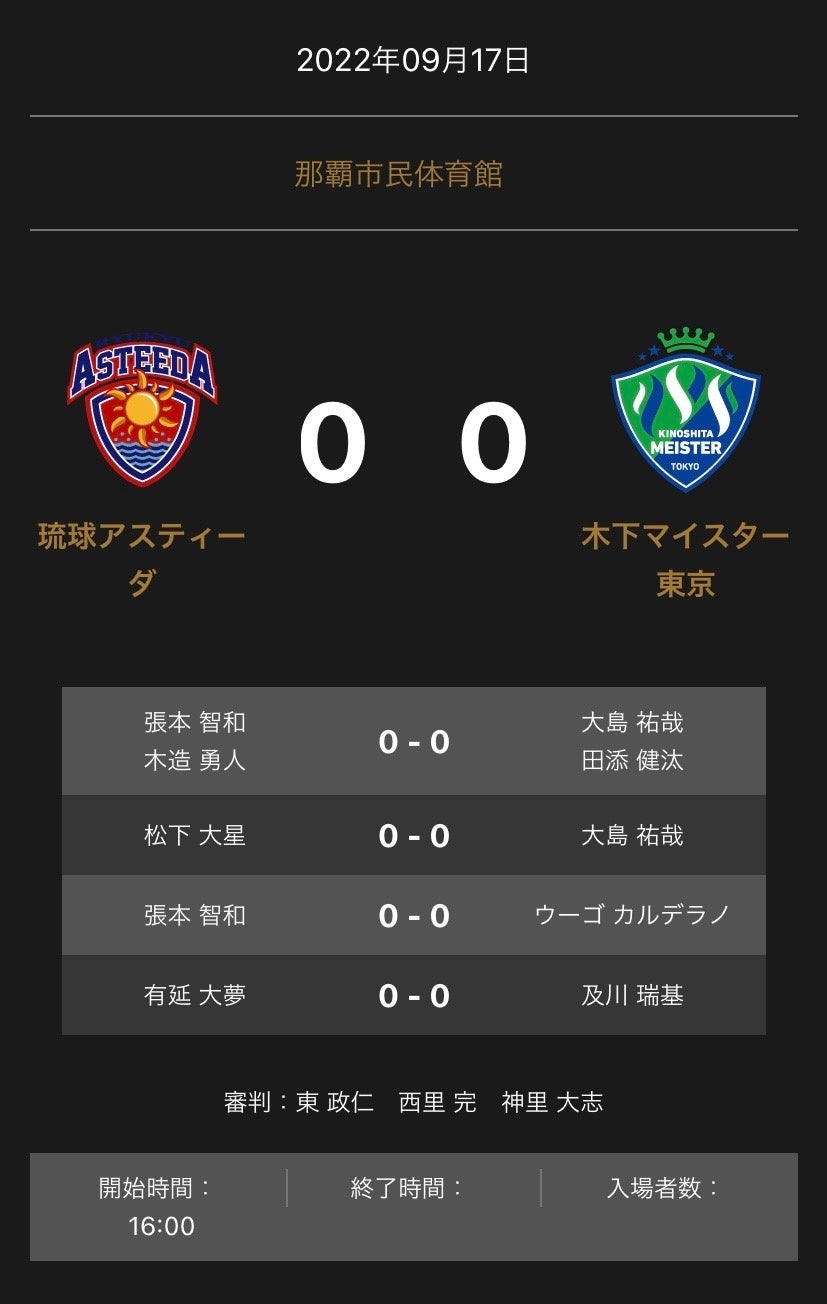 ノジマTリーグ 2022-2023シーズン 公式戦 9月17日開催 琉球アスティーダ vs 木下マイスター東京 オーダー発表