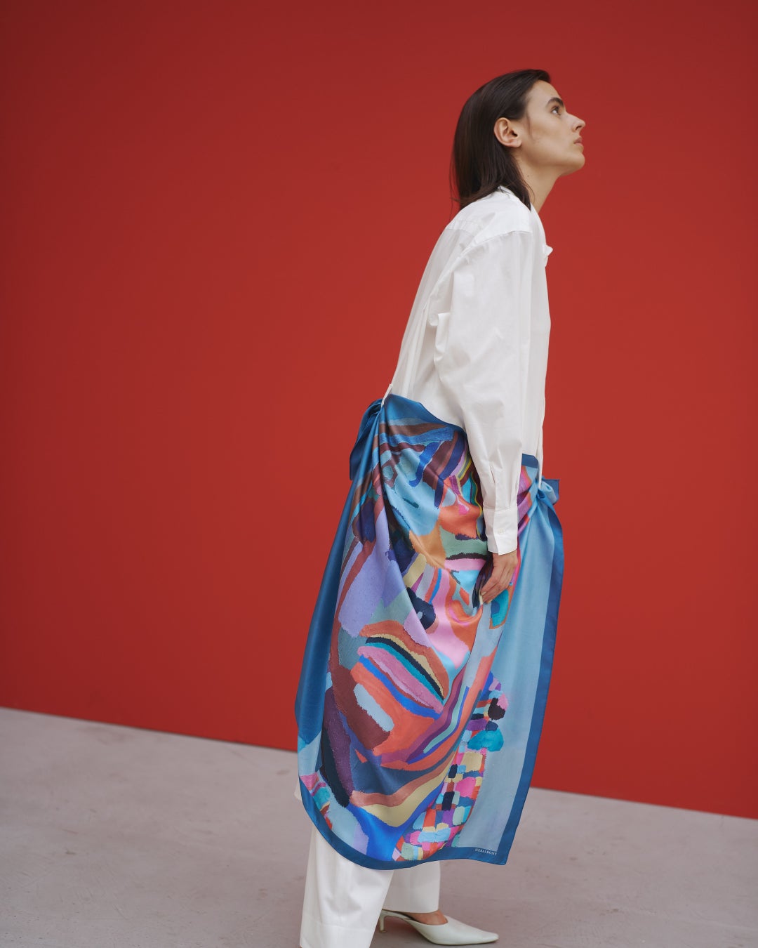 異彩を放つ作家の筆使いを忠実に再現するため、シルク素材100%にこだわりました。ずっと触っていたくなるようなハリのあるなめらかな手触りで、いつもの装いに特別な彩りを添えてくれます。