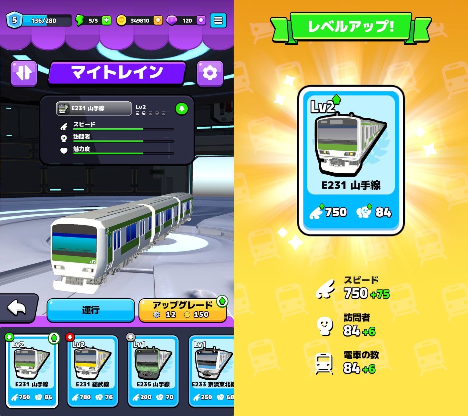 さらに車両をアップグレードすることで編成数やの街への訪問者数増加、街を発展させることができます。
