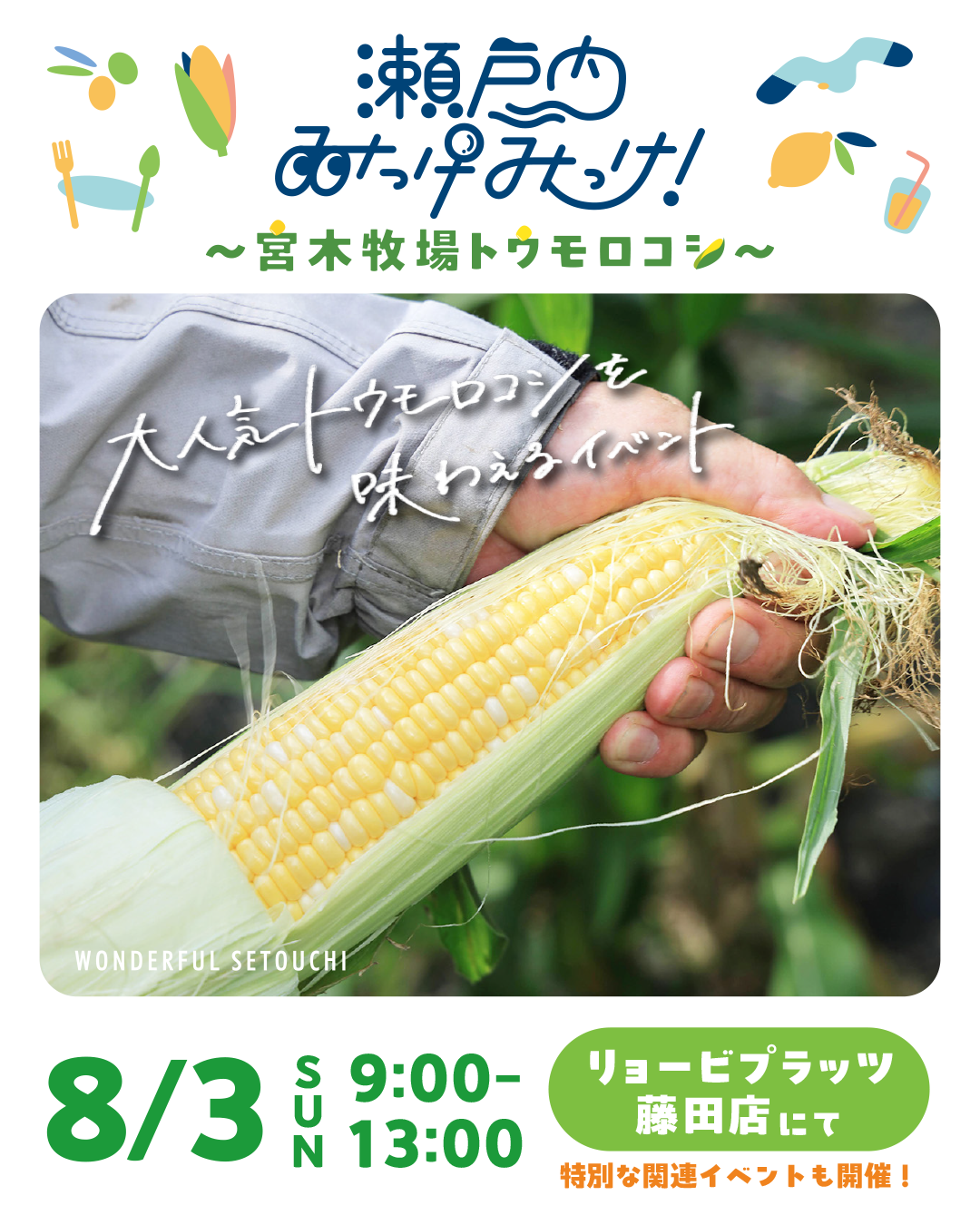 その第1弾として、2025年8月3日(日)、リョービプラッツ藤田店にて、岡山・吉備高原の『宮木牧場』が栽培する、朝採れトウモロコシの特別販売を行います。地元直売所では開店直後に即完売する日もある“逸品”を、今回は産地からそのまま直送。普段はなかなかめぐり合えないとびきりの味と、生産者との出会いをお楽しみください!