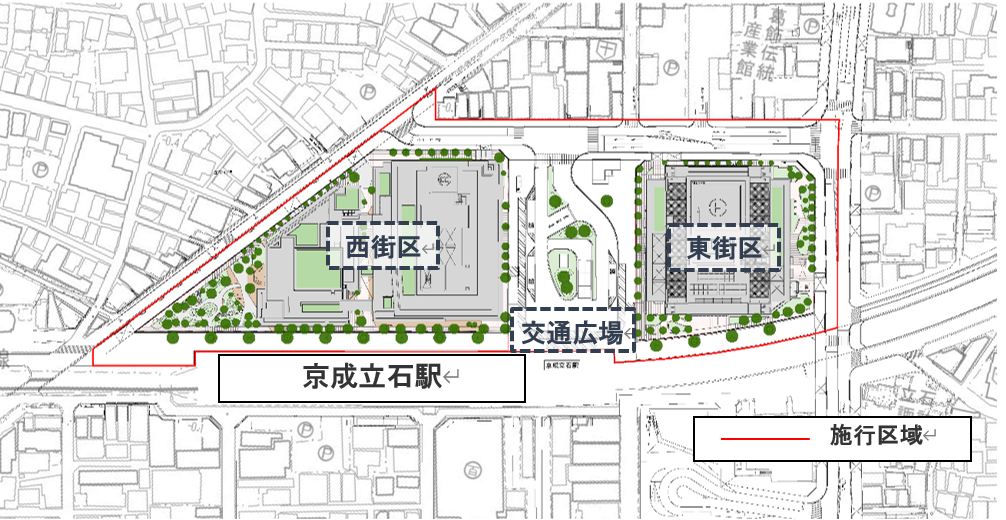 本事業は京成押上線京成立石駅北側に位置する約2.2haのエリアにおける市街地再開発事業です。当エリアは商店街を中心とした駅前の商業地として古くから発展してきましたが、道路が狭く、老朽化した木造建築物等が密集するなど、防災性の向上や居住環境の改善が課題となっていました。このような状況を受け、本地区では1996年度に「立石駅北口地区再開発研究会」が発足、2007年度には「立石駅北口地区市街地再開発準備組合」が設立され、以降、市街地再開発事業の施行を念頭に具体的な検討が実施されてきました。その後2017年度に都市計画決定、2021年度に本組合の設立が認可され、2023年度の権利変換計画認可を経て、この度東西街区の新築工事に着手しました。