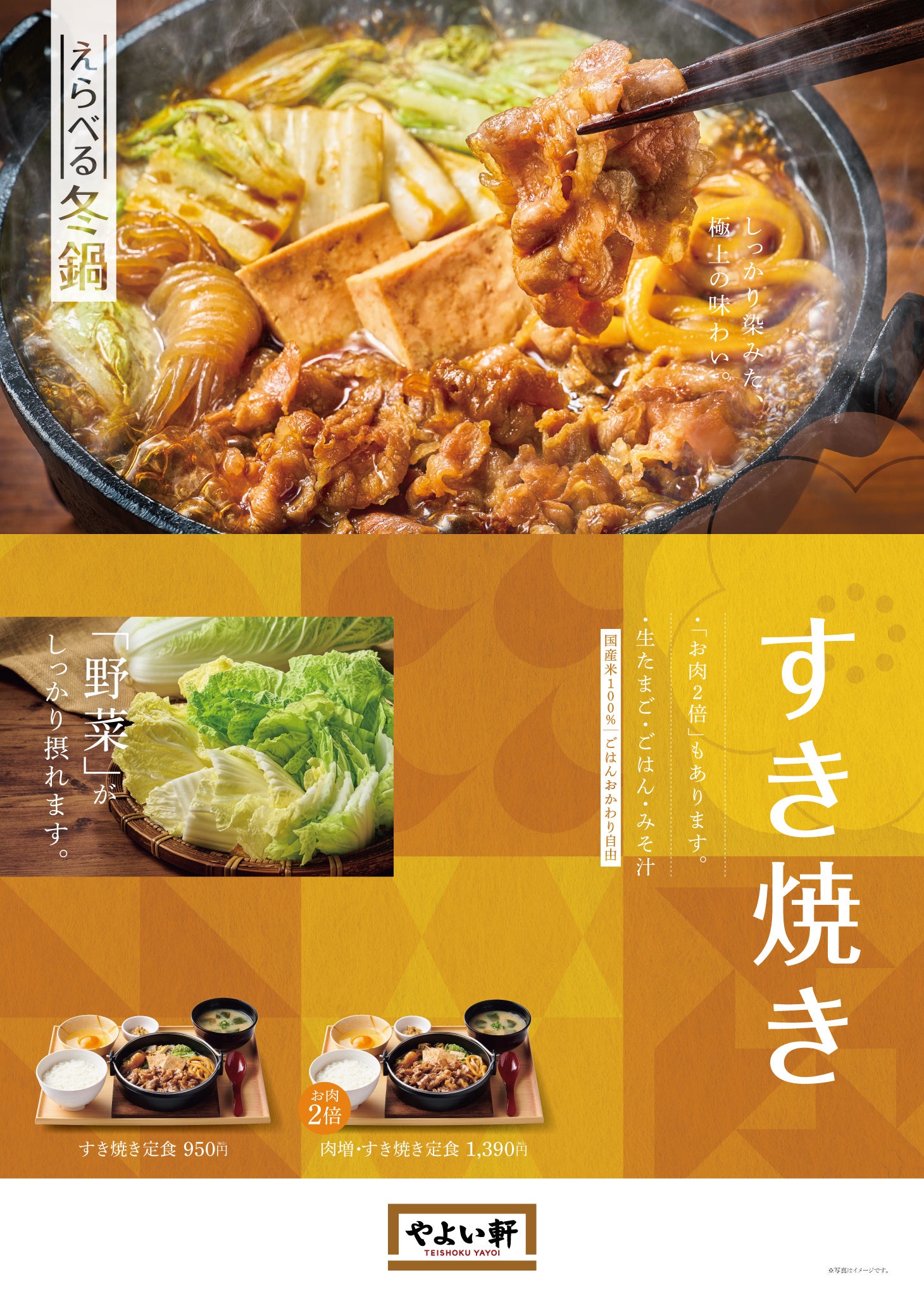 毎年、大人気の鍋定食が今年も発売となります。第一弾には冬の定番メニュー『すき焼き定食』が登場です。たっぷりの牛肉、体にも嬉しいヘルシーな野菜、うどんを3種の本醸造醤油と本みりんをブレンドした旨味豊かなたれでじっくりと煮込みました。しっかり味のしみ込んだ肉や野菜を、「やよい軒」こだわりの炊き立てごはんとご一緒にお召し上がりください。また、たれの味がしっかりしみ込んだ具材は、生たまごに絡めることでまろやかな味わいもお楽しみいただけます。