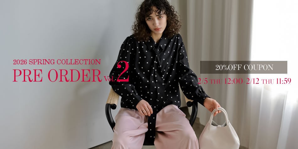 2026 SPRING PRE ORDER vol.2開催期間中(2026 2/5 12:00 - 2/12 11:59)は、対象の新作アイテムに使える先行特典20%OFFクーポンを配布します。
