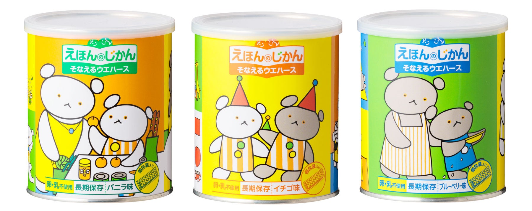有名な絵本の缶に入った長期保存できる非常食。卵、乳成分を使用せずに誰もが食べやすいサクサクとした食感の美味しくて優しい味のウエハースです。