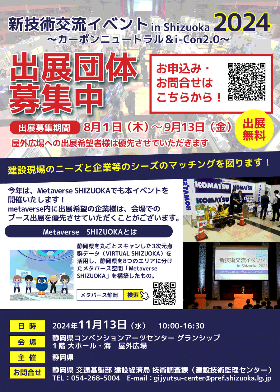 今年も建設現場が抱えるニーズと企業等が保有する技術シーズのマッチングを図り、地域が抱える課題の解決や生産性の向上に繋げる「新技術交流イベント in Shizuoka2024」の開催を予定しております。このたび8月1日より出展募集を開始しました。