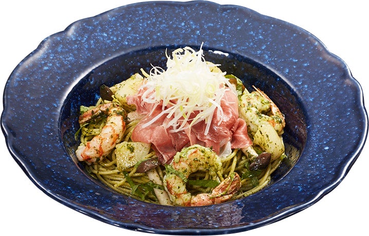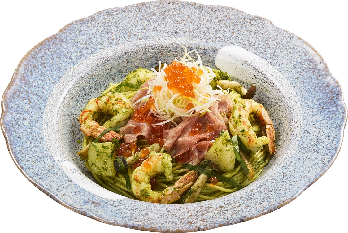 爽やかな風味の大葉ジェノベーゼを、生ハムや赤エビと一緒にお楽しみいただけるパスタです。ジャガイモやしめじ、白髪ネギも使い、食べ応え抜群の一品に仕上げました。