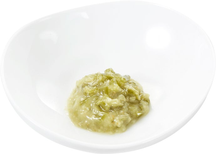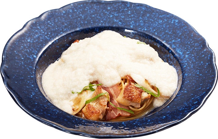 グリルチキンやベーコン、長ネギを使った和風パスタに、出汁入りの温かいとろろをトッピングしました。ふわふわのとろろは、のど越しが良く軽やかな口当たりです。お好みで別添えの刻みワサビを加えてピリッと爽やかな味わいに、焦がし醤油を加えて香ばしくコク深い味わいへの変化をお楽しみください。