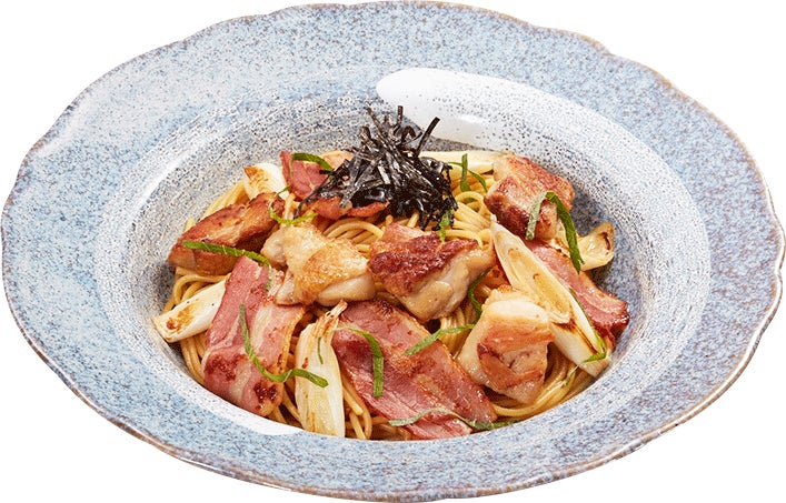 たっぷりのグリルチキンやベーコン、長ネギを使った和風パスタです。チキンの香ばしい風味やソテーしたベーコンの旨み、長ネギの甘みが、ガーリック香る焦がし醤油ソースのパスタと相性抜群です。