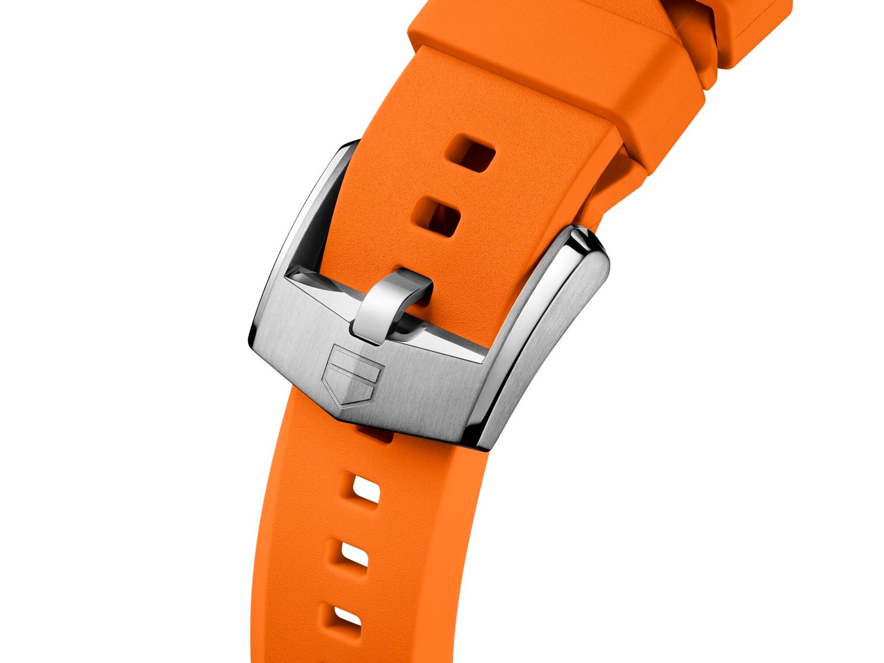 ストラップシステムはデザインを一新し、ラバー、レザー、メタル、ナイロンなど、幅広い素材とカラーに対応しています。45 mmモデルには、腕元のバランスと安全性を考慮してフォールディングバックルが組み合わされていますが、アクセサリーコレクションのスポーツストラップにはピンバックルが採用されています。40 mmモデルでは、ラバーストラップにピンバックル、レザーストラップにはフォールディングバックルを組み合わせ、デザイン全体の統一感を保っています。