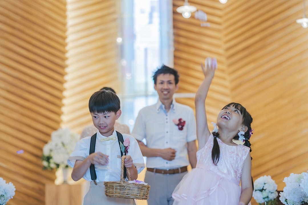 退場時に花びらやリボンを撒いて祝福。写真映えも抜群です。