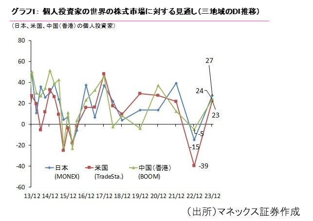 各地域の個人投資家に今後3か月程度の世界の株式市場に対する見通しをたずねたところ、日本、米国、中国(香港)の個人投資家いずれも前回調査(2022年12月実施)からDIが大きく上昇しました。