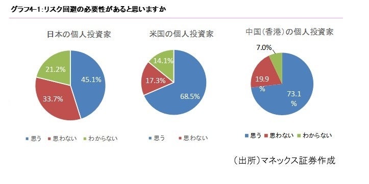 三地域の個人投資家に現在のマーケットの状況はリスク回避をある程度行う必要があると思うかをたずねたところ、米国、中国(香港)の個人投資家はリスク回避の必要性が「ある」との見方が7割程度ある一方、日本の個人投資家は5割を下回っています。