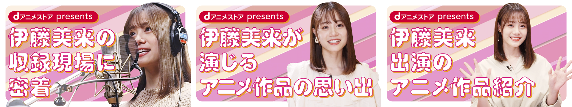 dアニメストアでは、新CMの公開に合わせて特別番組「dアニメストアpresents 伊藤美来とアニメにまつわるエトセトラ」を制作!普段なかなか見ることができないCMの収録現場に密着した秘蔵映像をはじめ、伊藤美来が演じるアニメ作品の思い出など、このたびの企画でしか見られない3つの撮りおろし動画を順次公開。新CMのキャラクターの声をキュートに彩った伊藤美来の魅力を、dアニメストアが全力でお届けします。