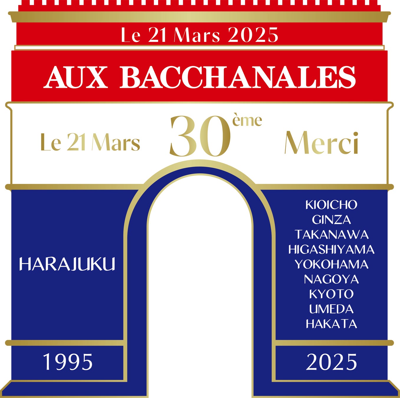 30周年記念ロゴは各店舗からの道が1つに集まる象徴として、パリのランドマーク「凱旋門」をモチーフにデザインしました。それぞれの柱には、ビル建替えにより惜しまれつつ閉店した1995年創業の原宿店と、30周年企画対象の9店舗を記載しています。