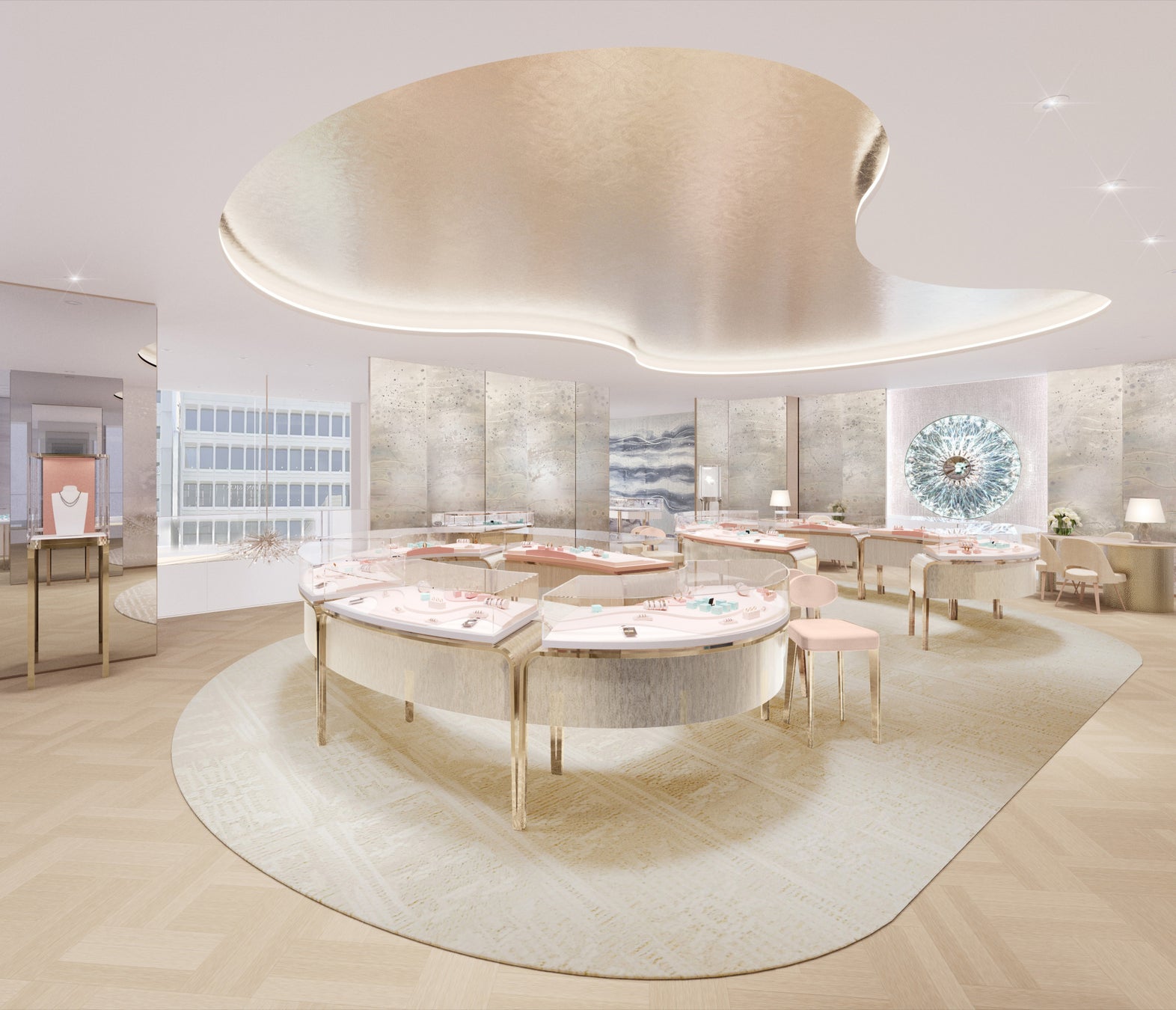 「ティファニー銀座本店」は、約890㎡の広さで2つのフロアから構成されています。店内空間は緩やかなカーブのディテールとソフトなカラーパレットで演出され、洗練された温かみを感じさせます。1階フロアには、ティファニーを代表する「ティファニー T」「ティファニー ハードウェア」「ティファニー ロック」などのアイコニックなコレクションが並びます。