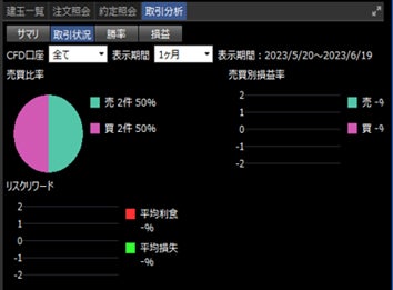 2.「取引分析」:指定期間の売買比率や売買損益率、勝率など、CFD取引の取引分析ができる!