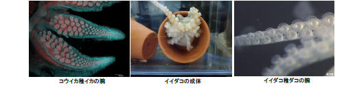 瓶の蓋を開けるなど、高い知能を持ちさまざまな行動を取りますが、この行動の実現に欠かせないのが吸盤です。東京大学三崎臨海実験所では、吸盤の形成過程やその際に必要な遺伝子について研究をしています。水槽には本物のイカやタコやイカも展示いたしますので、実際の吸盤や動きを観察すると、新たな発見があるかもしれません。