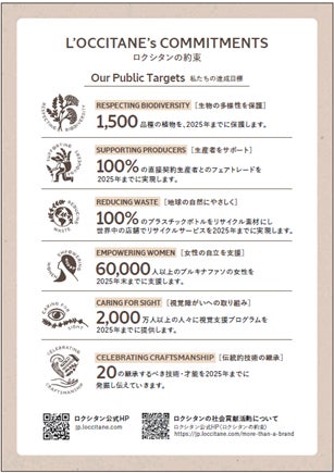 創設当初から、南仏プロヴァンスをはじめとする豊かな自然や、そこから生まれる製品を作り出す人々と技術を守ることを使命としてきたロクシタン。ブランド創設時に空のガラスボトルを店舗で回収するシステムを設けていたなど、現在に至るまで地球環境へ配慮した様々な取り組みを実施してまいりました。現在では「ロクシタンの約束」として、「植物の多様性の保護」「生産者をサポート」「地球の自然にやさしく」「女性の自立を支援」「視覚障害への取り組み」「伝統的技術の継承」の6つのCSR活動を掲げ、具体的な目標数値を定めて達成に向けて各国で活動しています。