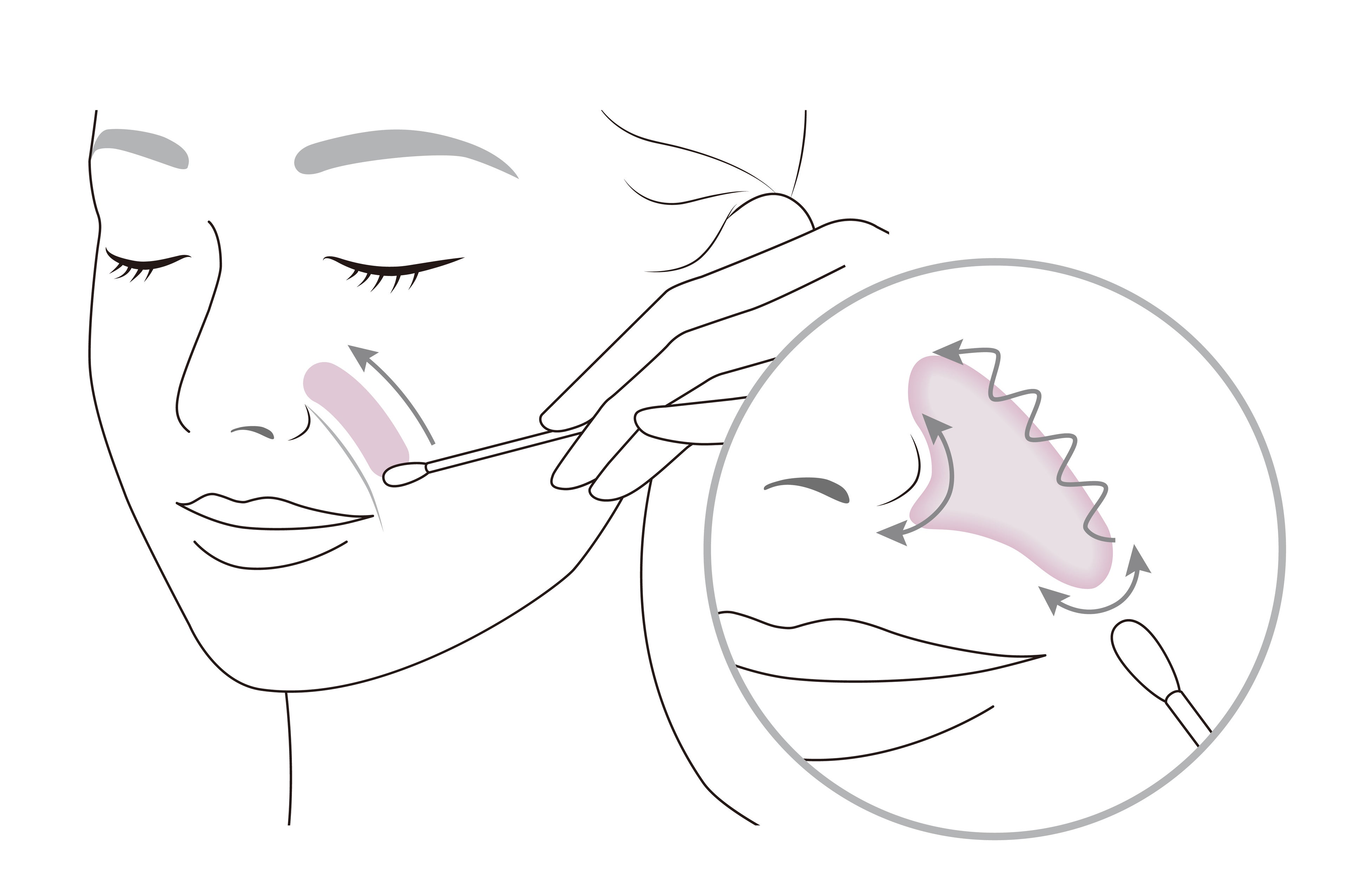 3.手持ちの綿棒を寝かせるようにあて、下から上に5~10回程度手早く動かして、ざらつき感がなくなるまで薄く均一に整えます。小鼻の周りは特に念入りに薄くします。口角付近に液がついてしまった場合は、綿棒で取り除きます。