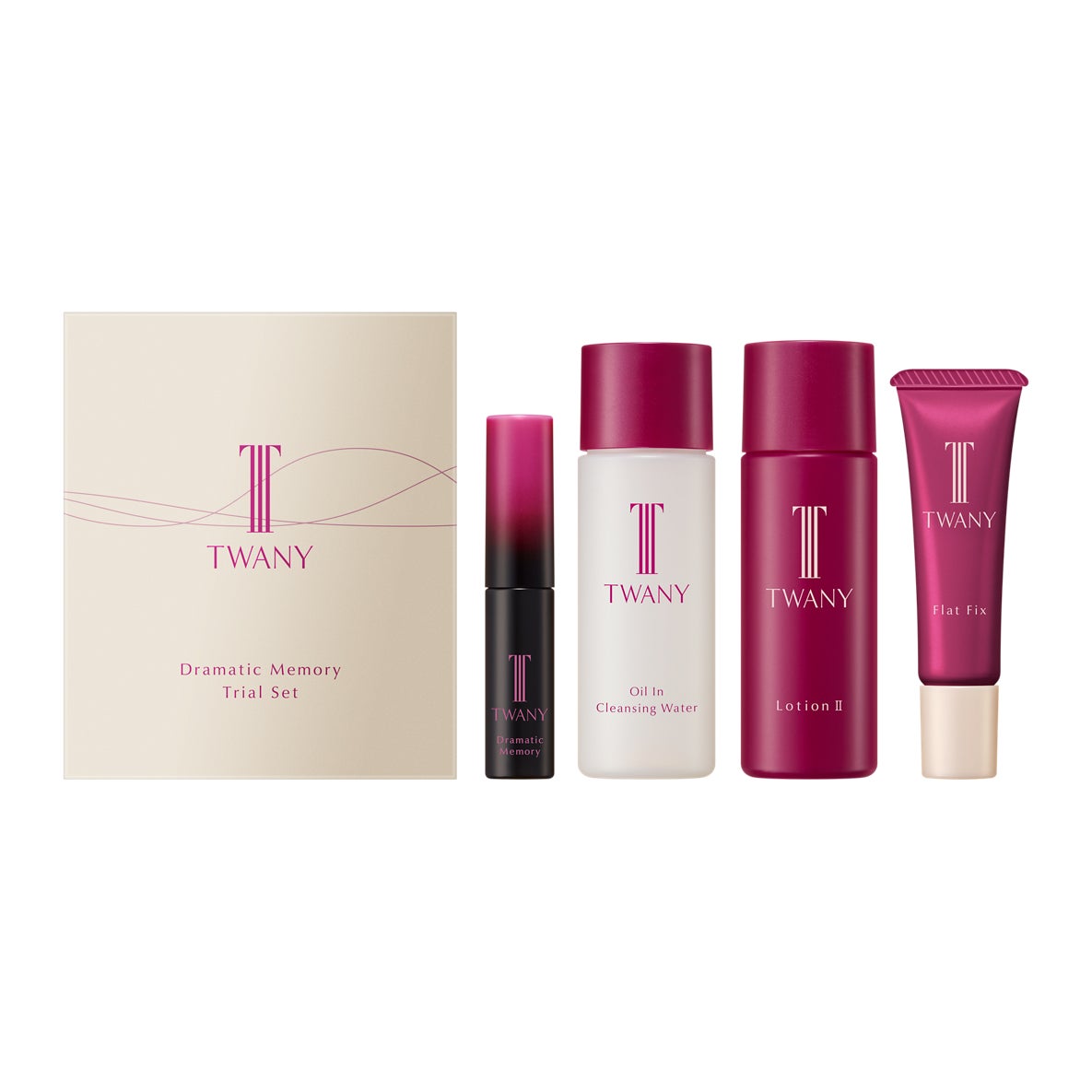 『トワニー ドラマティックメモリー』と一緒に使えるおすすめの4ステップアイテム(ミニサイズ)が入った約10回分のトライアルセット。本商品のミニサイズ、「トワニー」の化粧水、化粧下地、クレンジングの各ミニサイズの4品。