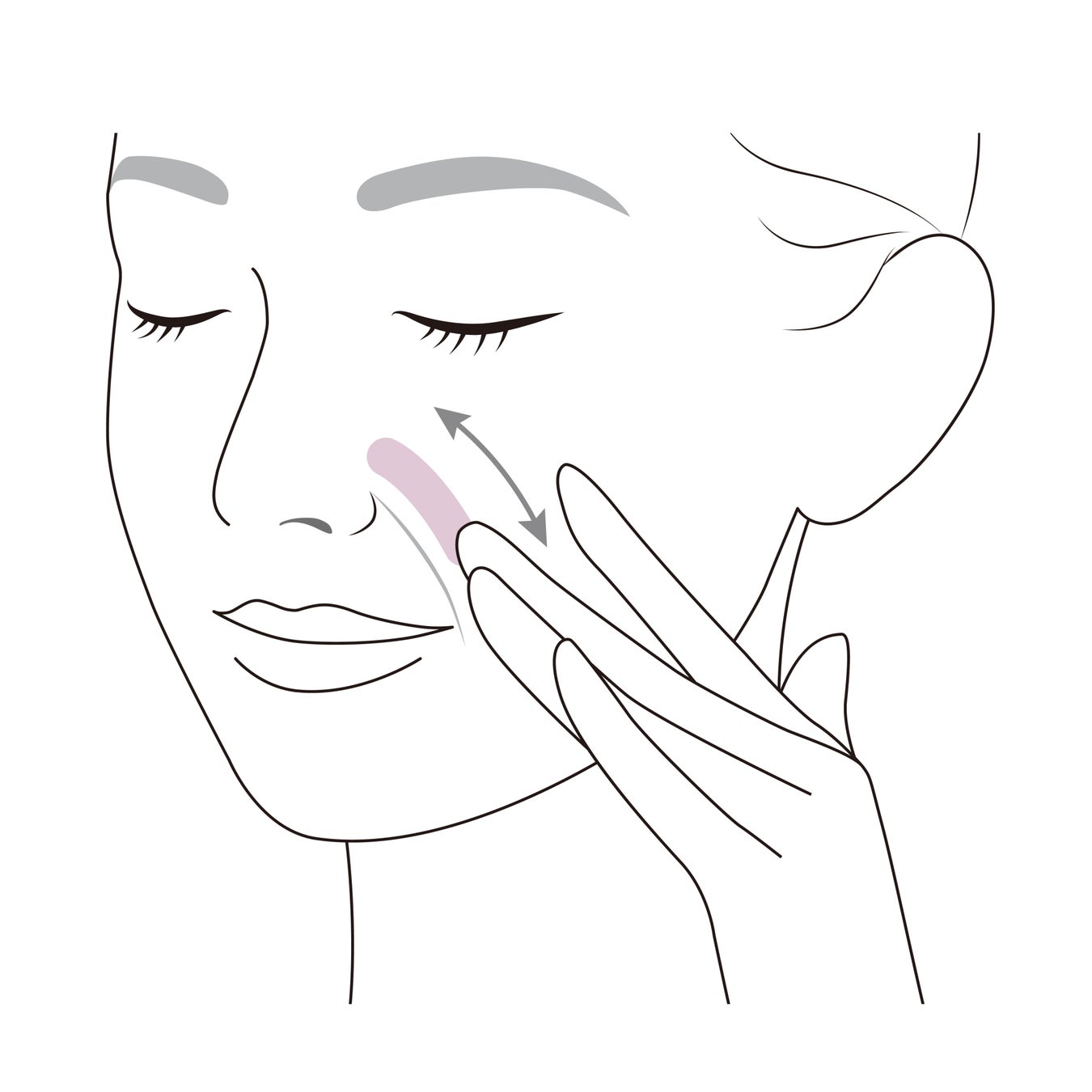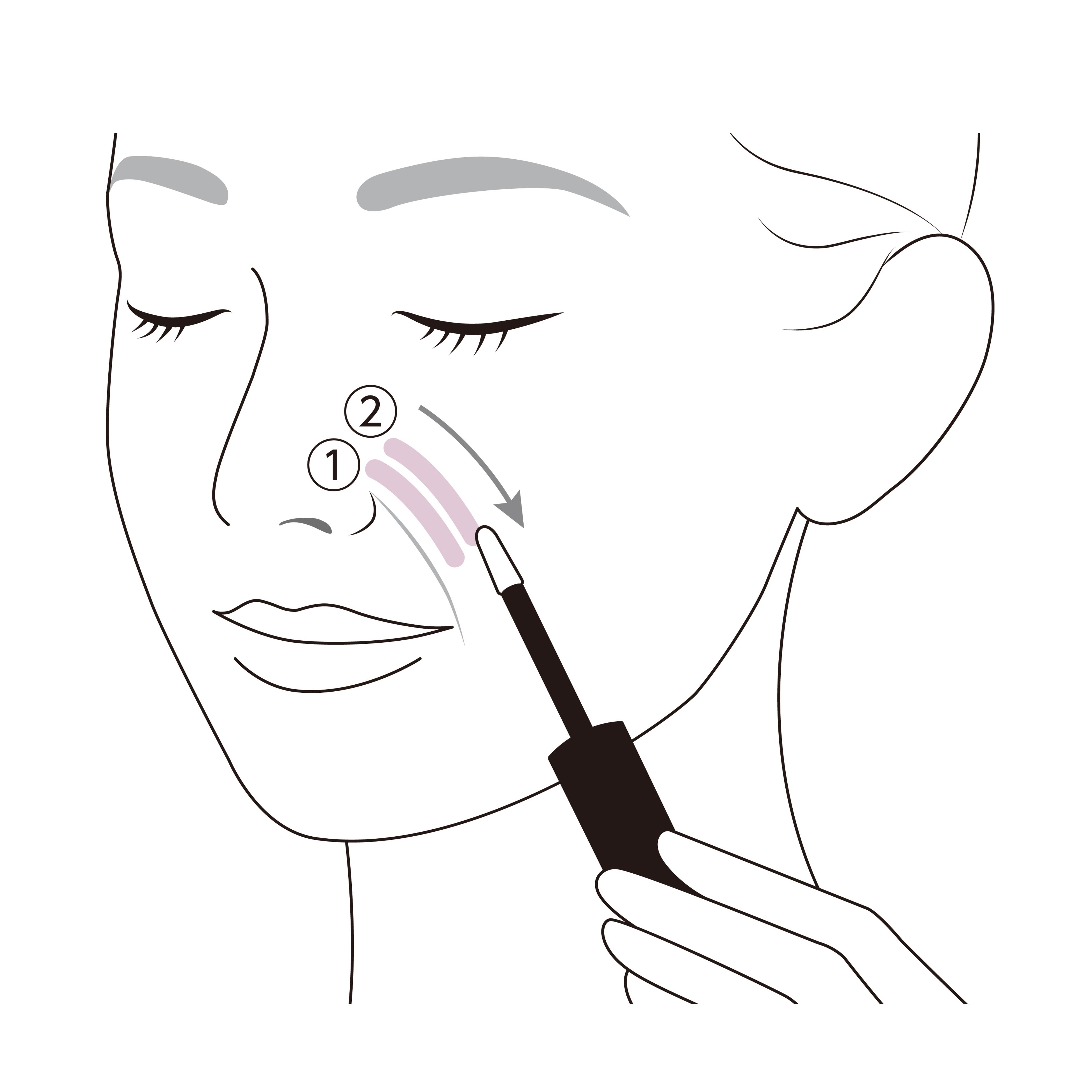 1.ボトルからチップをしごかず抜き、ほうれい線に沿って、小鼻の横から小鼻と口角の中間まで線を引くように塗ります。再度付け直し、1本目の線のすぐ横に同じ長さで塗ります。
