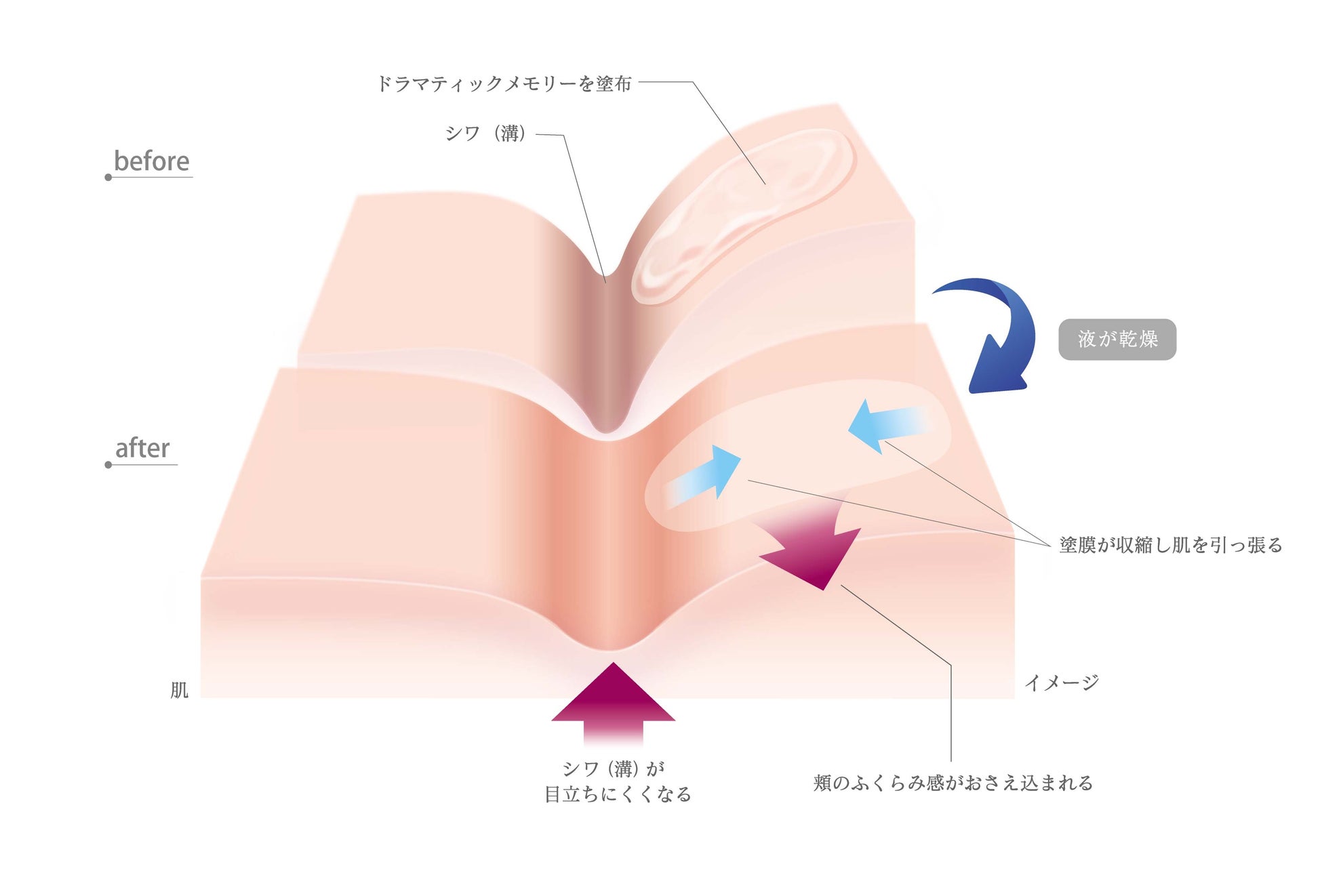 塗膜収縮によって肌を引っ張り、シワ(溝)と頬のふくらみによる影を減らして