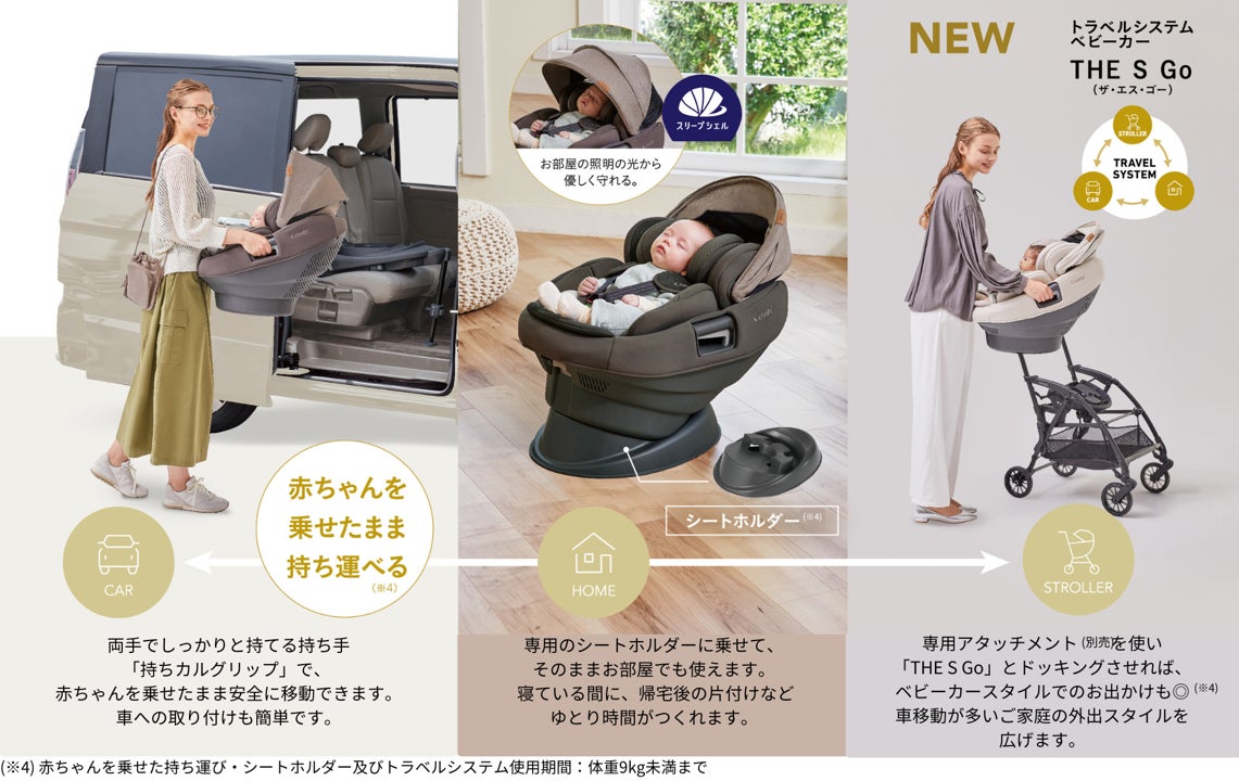 また、赤ちゃんを乗せるシート部分と車の座席に固定するためのベース部分が着脱できる“セパレート構造”を活かし、新たに「トラベルシステム」機能を備えました。別売りのアタッチメントを用いてベビーカー「THE S Go(ザ・エス・ゴー)」と組み合わせれば、ベビーカースタイルでおでかけができます(※3)。車内で眠ってしまった赤ちゃんを起こさずに、そのまま移動ができる「THE S」シリーズの特⾧を活かした、新たなおでかけスタイルを提案します。車移動が多いご家庭におすすめです。