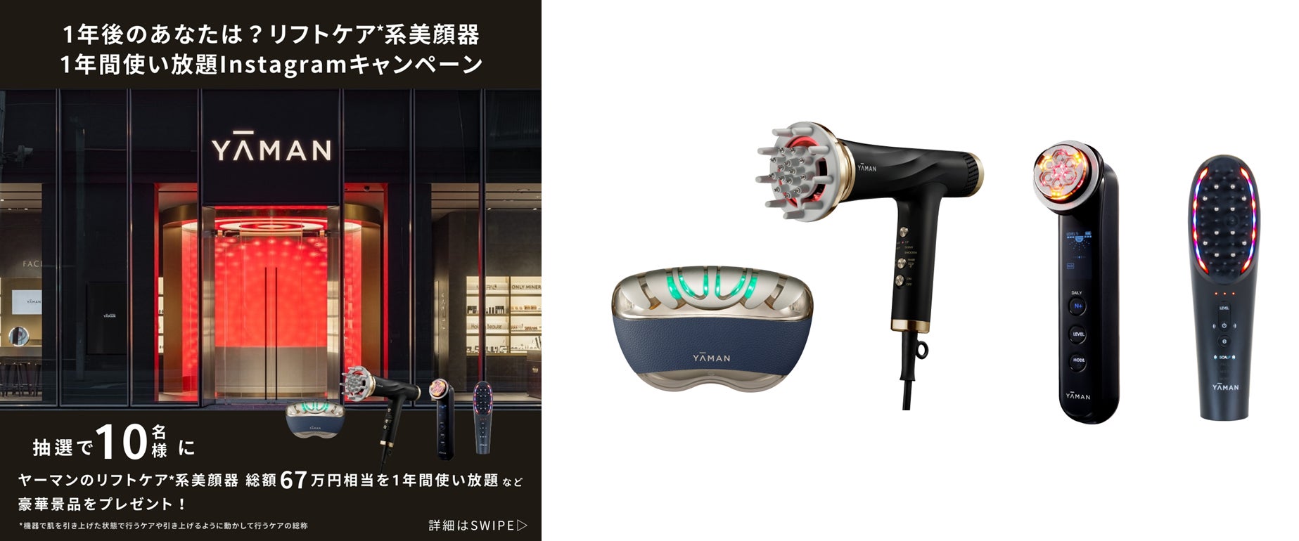 「YA-MAN the store GINZA」公式Instagramをフォローの上、該当の投稿のコメント欄に「好きな美顔器」をコメントいただくと、抽選でヤーマンのリフトケア*5系美顔器、総額67万円相当を1名様に1年間お貸出しするキャンペーンを実施。CERTREC*4(サーテック)+RF(ラジオ波)搭載のヤーマンにおける最高峰美顔器*8『YA-MAN THE MIYABI』のほか、『リフトロジー SP』、リフトケア*5には欠かせない頭皮もケアできる「YA-MAN PROFESSIONAL」のドライヤー『ヴェーダリフトドライヤー』、『ヴェーダハイパーフェイスリフトブラシ』、の人気4製品をラインアップ。そのほか景品をご用意しております。