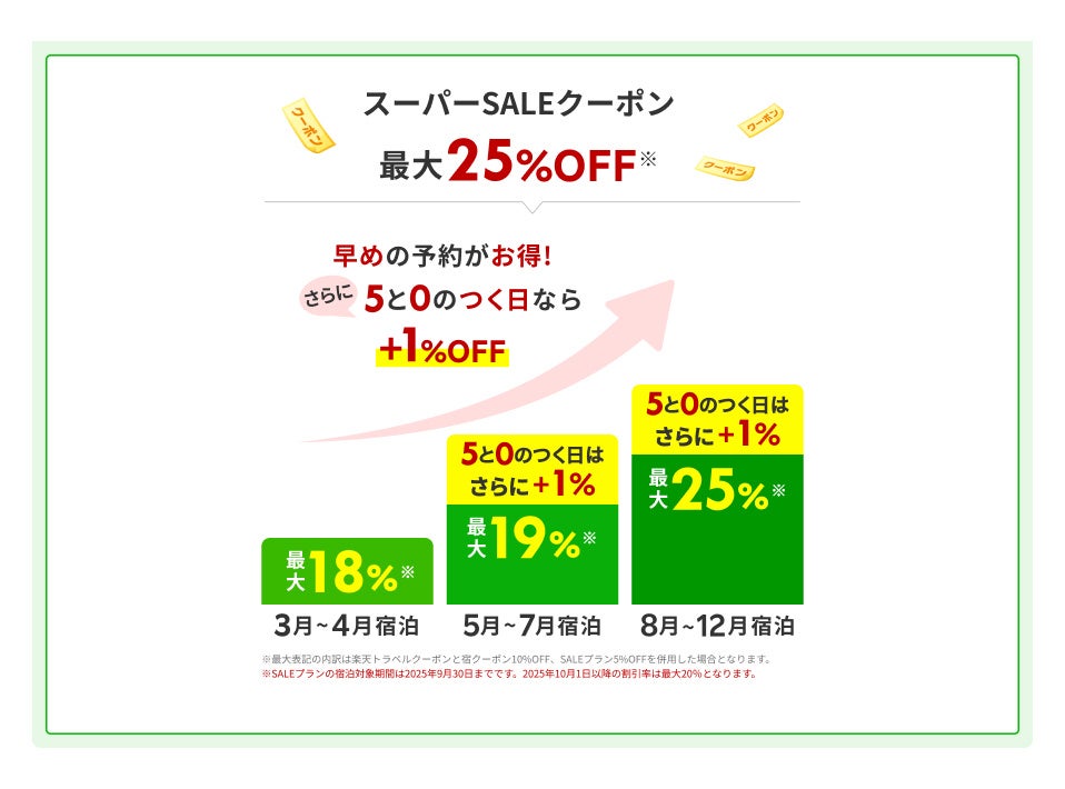 - セールプランとクーポンを組み合わせることで、国内宿泊が毎日最大25%オフに -