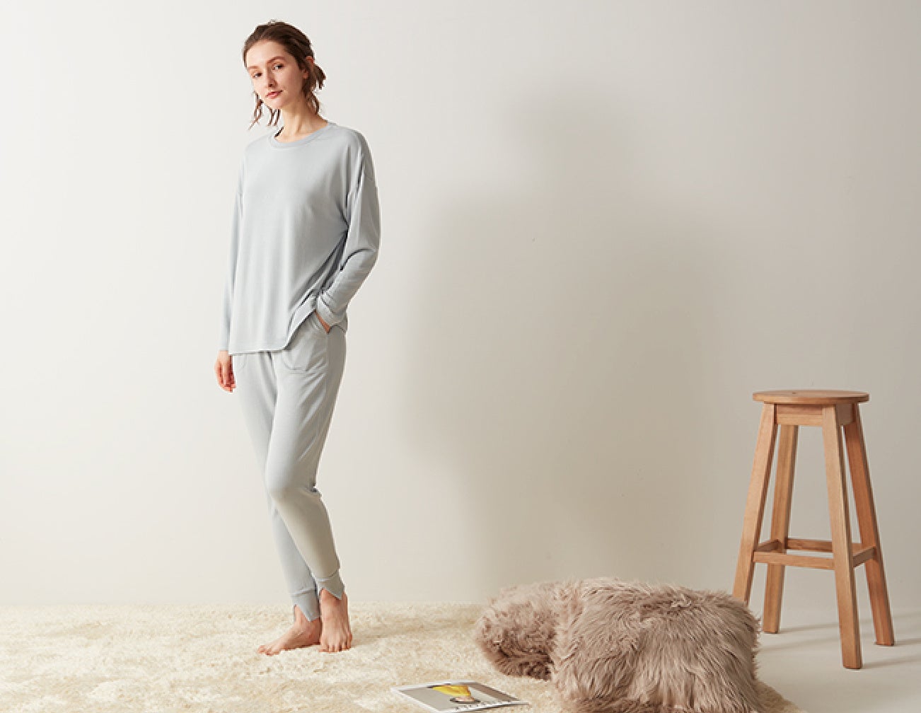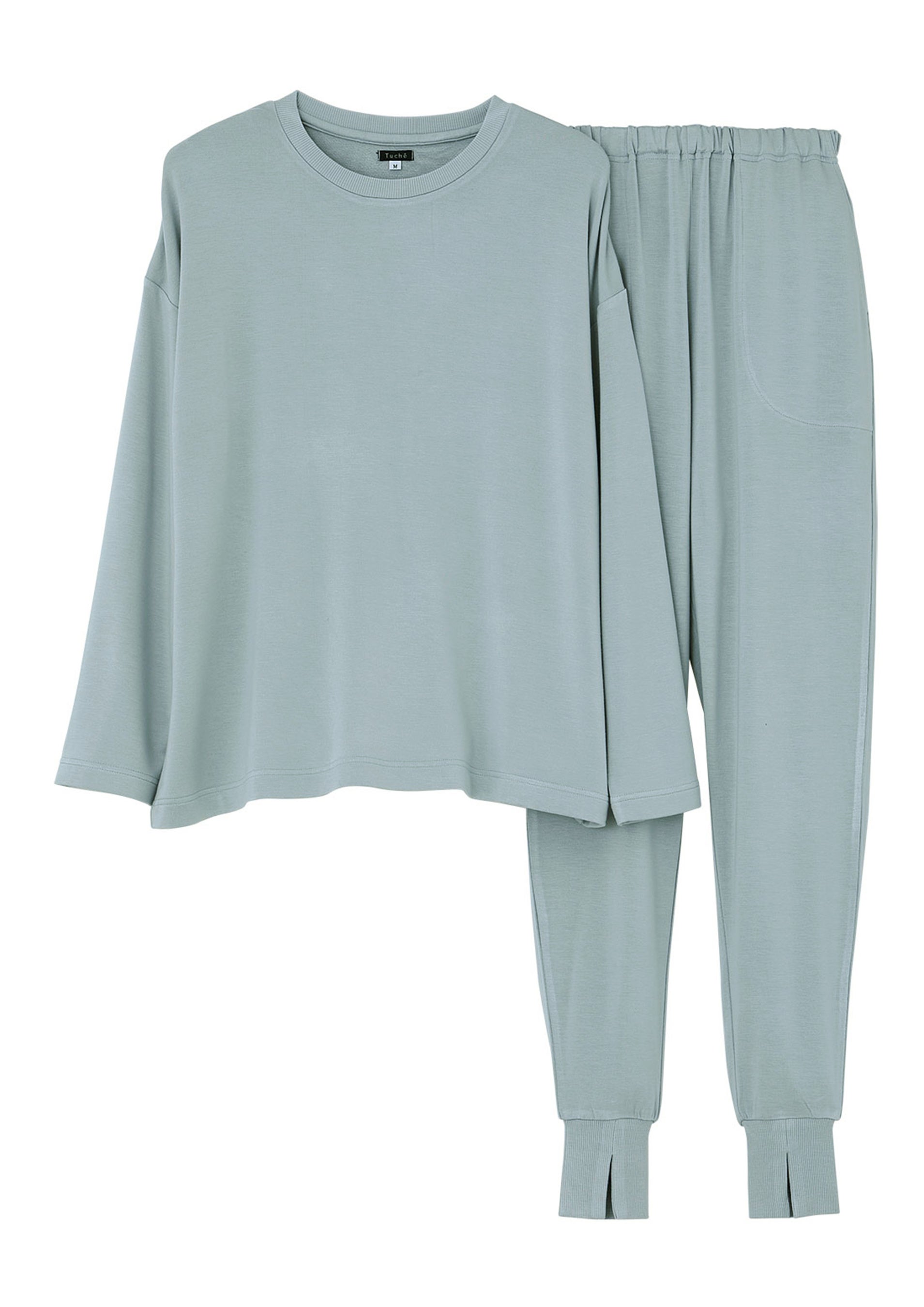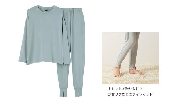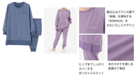 「Tuché」スイーツファブリックシリーズは、素材の特長をスイーツにまつわる言葉で表現したシリーズで、これまでも「カヌレベロア」などの商品名でルームウェアを発売。肌ざわりにこだわった素材と大人かわいいデザインが人気のシリーズです。今回発売した「はちみつ裏毛」は、レーヨンの特長をいかしたなめらかでソフトな肌触りの素材を採用。ゆったりシルエットのトップスと足首リブ部分にスリットを入れたボトムを合わせるトレンドのスタイルに仕上げました。「フォンダンボアショコラ」は肌側ボアの厚手のあったか素材で、ヒップまでしっかりカバーするゆったりシルエットがかわいいルームウェアです。
