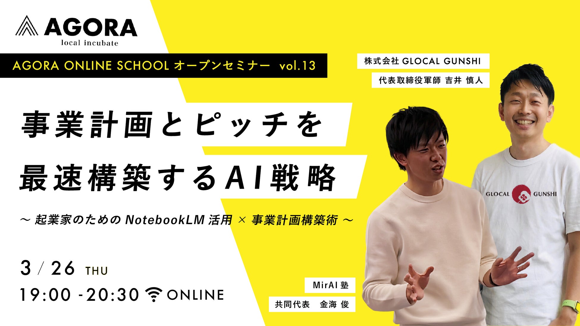 株式会社AGORAでは、2026年3月26日(木)に「NotebookLM活用」をテーマにした創業WEBセミナーを開催します。