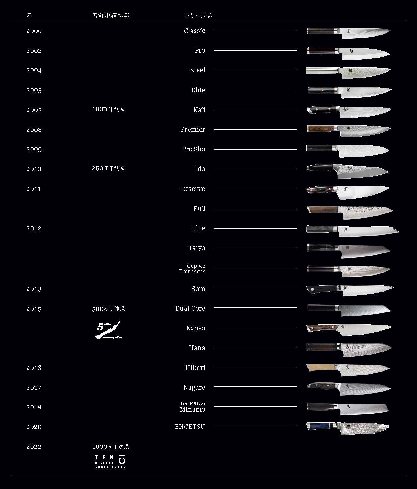 貝印の包丁技術を結集した世界に誇る包丁ブランド「旬」は、 2000年に欧米で発売を開始して以来、その機能性や美しさに対して世界中のお客様から好評をいただいてまいりました。 人気のシェフ・料理家の方々から一般のお客様まで、幅広い層から厚い支持を受けており、2022年10月には、累計出荷本数1,000万丁を達成いたしました。