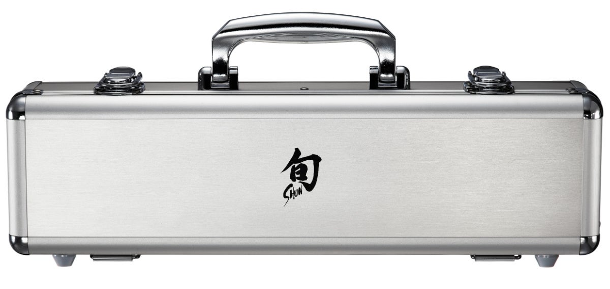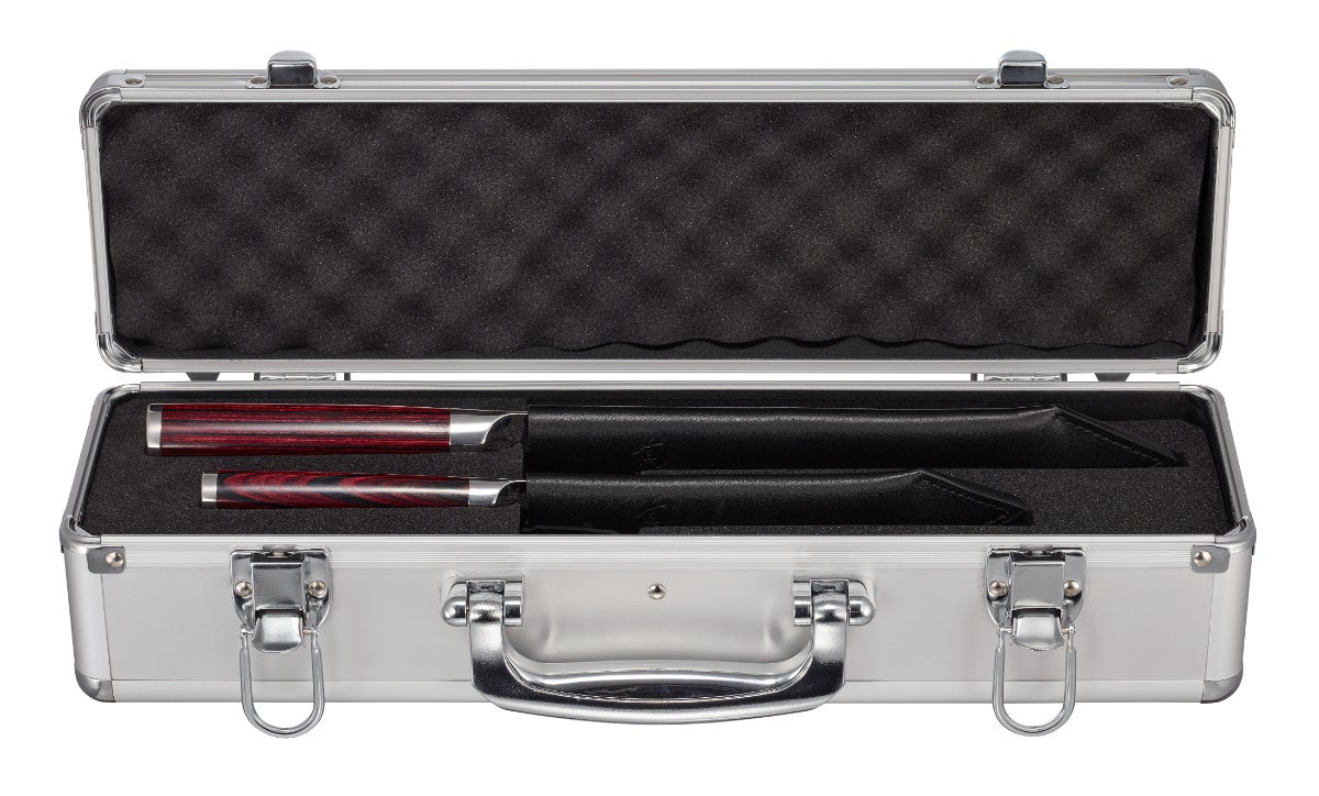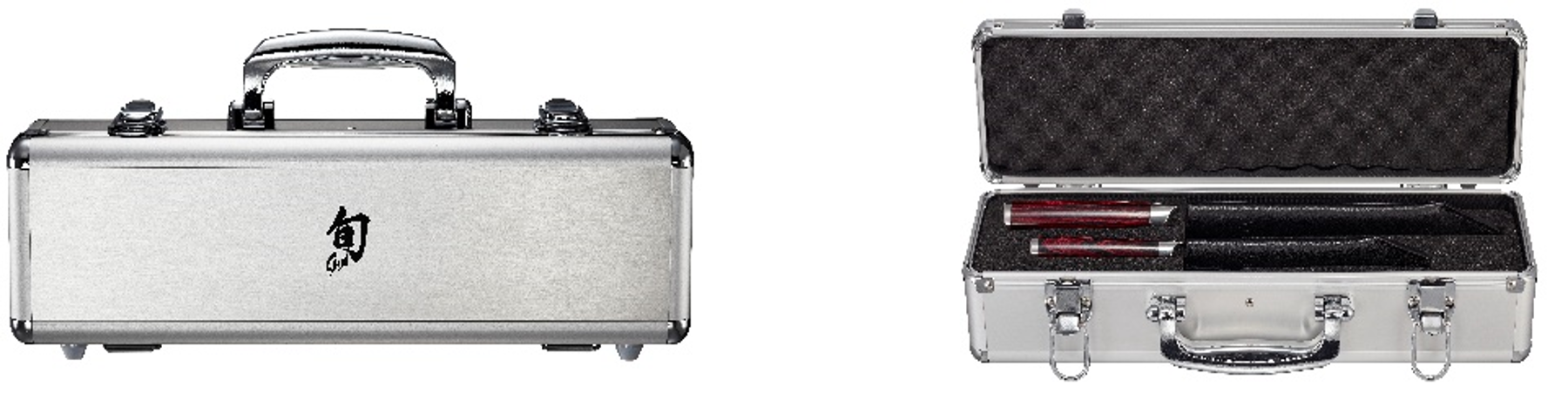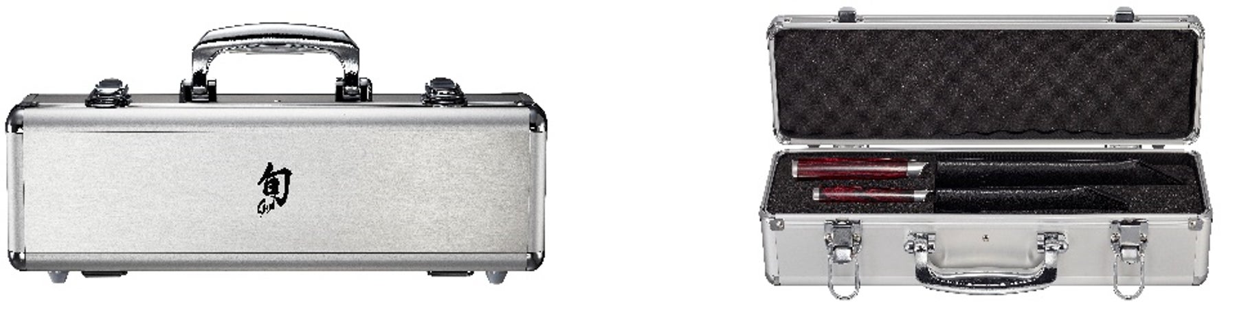 特別な時にお使いいただくために、保管ができるアルミケースに収めました。また、ブレードを傷つけないよう、革製のブレードガードも付属しています。