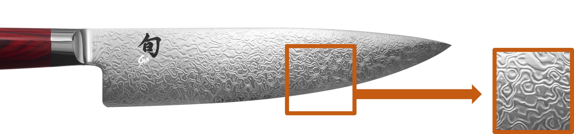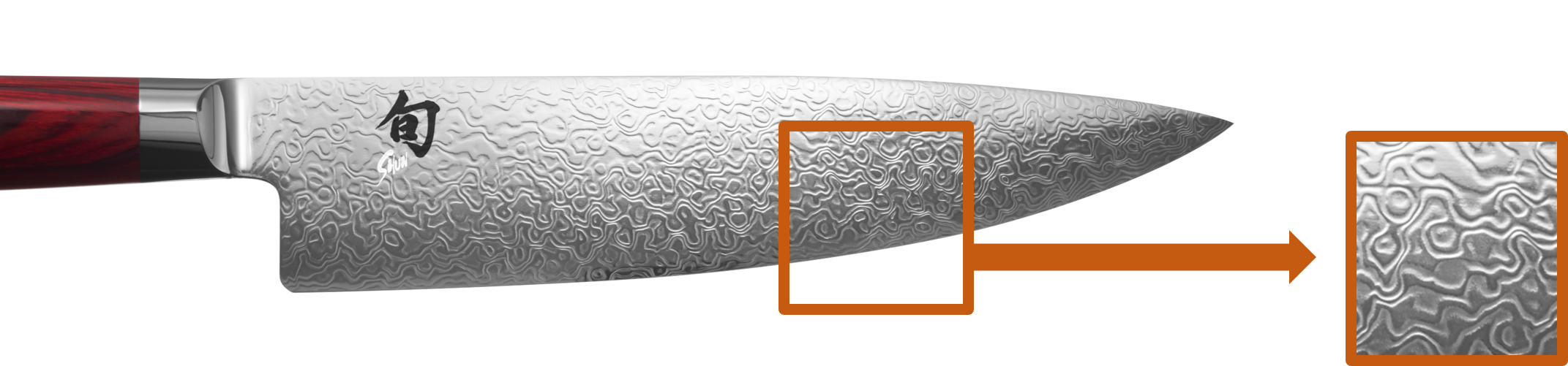 折り重ねられた高硬度の特殊ステンレス刃物鋼を採用することで、抜群の切れ味と耐久性を兼ね備えました。また、特殊な技術を用いることによって、刃先にまで現れた模様は、スムーズな切れ込みと、滑らかな切れ味を実現します。