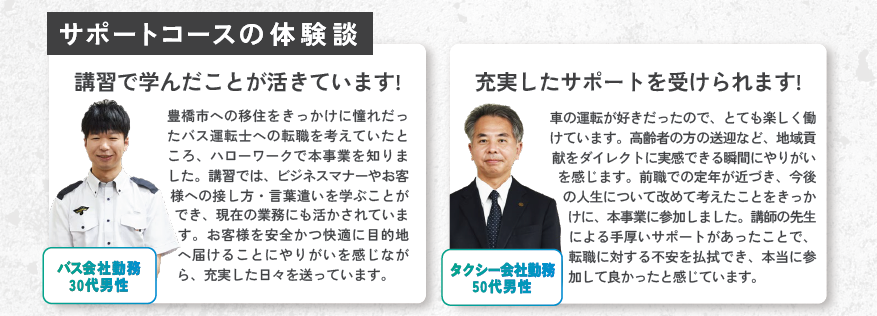 希望者には、⾯接までの⼿厚いサポートを⽤意しています。キャリアデザイン研修やビジネスマナー講習を受講したのち、市内交通事業者の⾯接を受けられます。講習では、業務に⽣かすことができる乗客への接し⽅や⾔葉遣いも学ぶことができます。また、すぐに選考、⾯接へ進めるスピードコースも⽤意しています。⼊社後は⼆種免許の取得⽀援制度もあるので、未経験の方も安⼼してご参加ください!