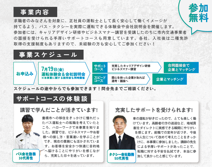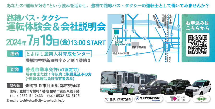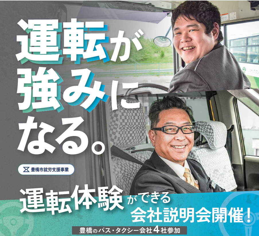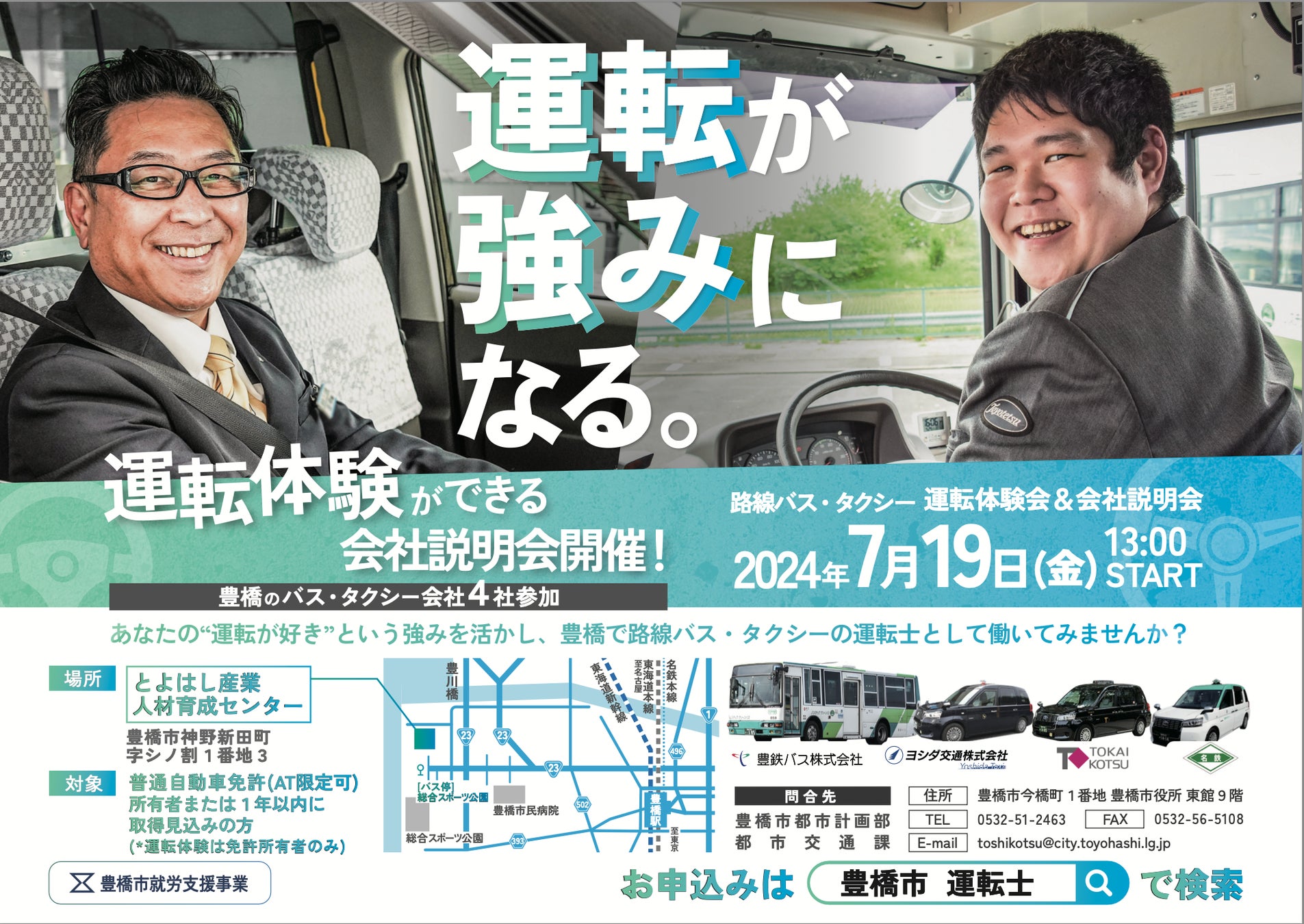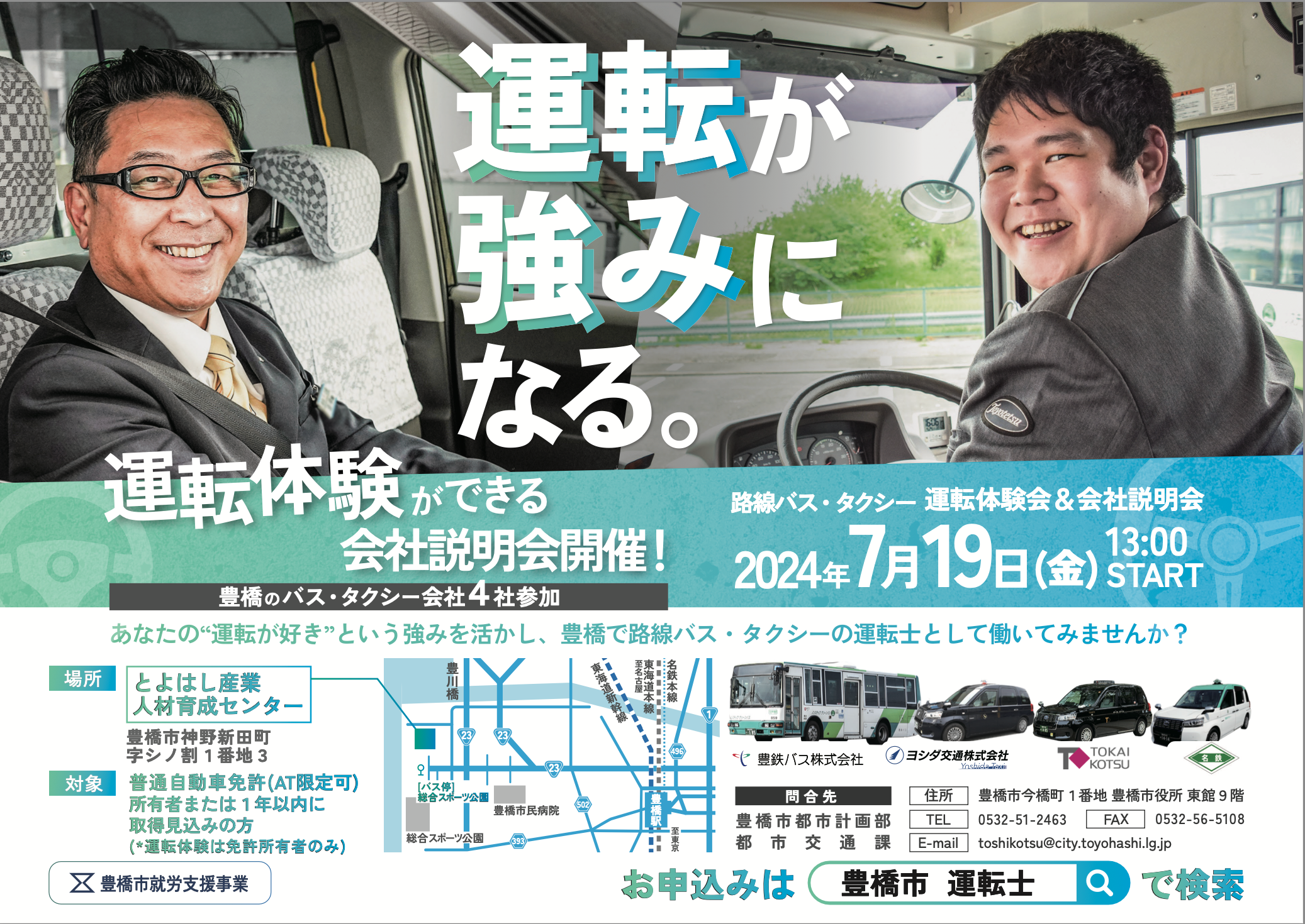 豊橋市では、公共交通を維持確保するため、路線バスやタクシーの運転⼠を目指す方への支援事業を実施しています。今年度は初の試みとして、2024年7⽉19⽇(⾦)に、市内のバス・タクシー会社4社が参加する「運転体験会」と「会社説明会」を開催します!この機会に公共交通を⽀える⼀員としての道を検討してみてください!