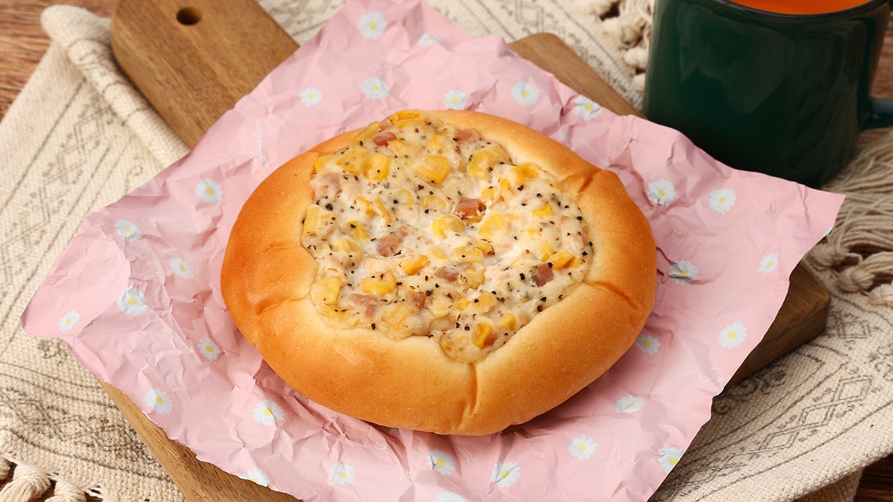 ベーコン・コーン・ブラックペッパーをマヨネーズで和えて絞り、ふんわりと焼き上げたスパイシーな味わいがクセになる惣菜パンです。ペッパーの風味があとひくおいしさです。