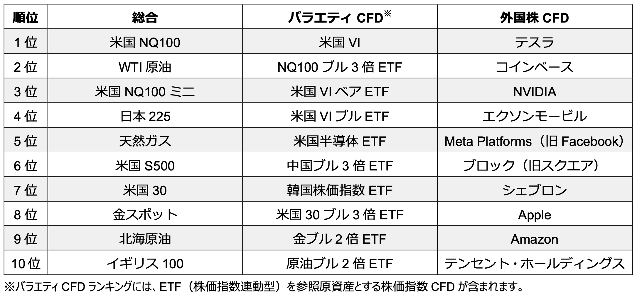 ~総合首位は米国NQ100!バラエティCFDでは米国VI、外国株CFDではテスラが首位に~