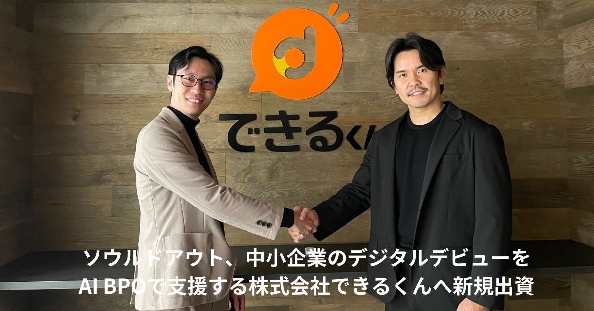 地方を含む全国の志ある中堅・中小企業の成長支援をデジタルマーケティング領域で展開するソウルドアウト株式会社(本社:東京都文京区 代表取締役社長CEO兼CCO:荒波 修、以下「ソウルドアウト」)は、中小企業のデジタルデビューをAI BPOで支援する株式会社できるくん(本社:東京都新宿区 代表取締役:岩田 真、以下「できるくん」)へ新規出資を行いました。