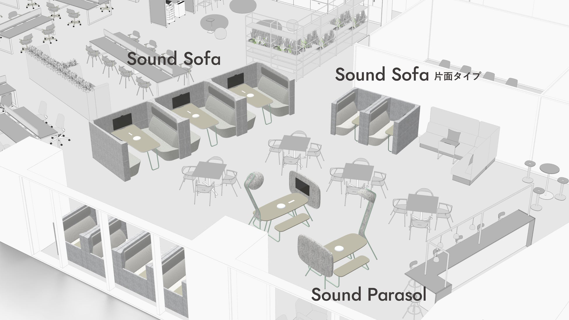 "sound furniture series"として、「sound parasol(サウンドパラソル)」と「sound sofa(サウンドソファ)」を合わせてご利用いただくことで、音声に配慮した多様なオープンミーティングスペースを形成できます。