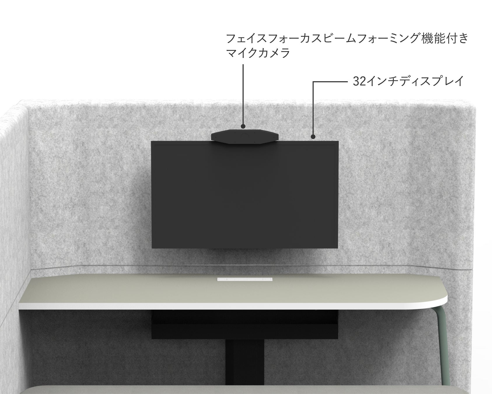 背面のパネルに指向性スピーカーを搭載。スピーカーから出る音声を最適な範囲にコントロールしているため、周囲への音漏れを抑えながら、座っている人にはWeb会議の音声がクリアに聞こえます。また、 32インチ大画面ディスプレイの上部に設置したマイクカメラはフェイスフォーカスビームフォーミング機能で集音範囲を制限しており、カメラで捉えた着座者の声のみを集音するため着座者の声が聞き取りやすく、クリアな音質のWeb会議を実現します。カメラ、マイク、スピーカー、モニターなどすべての機材が標準仕様となっており、お客さまご自身のPCを繋ぐだけで利用可能です。