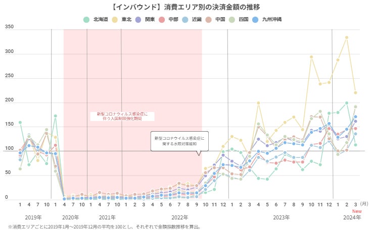 インバウンド消費のエリア別の推移を可視化したコンテンツを追加しました。インバウンド消費のエリア別の傾向がご確認いただけます。
