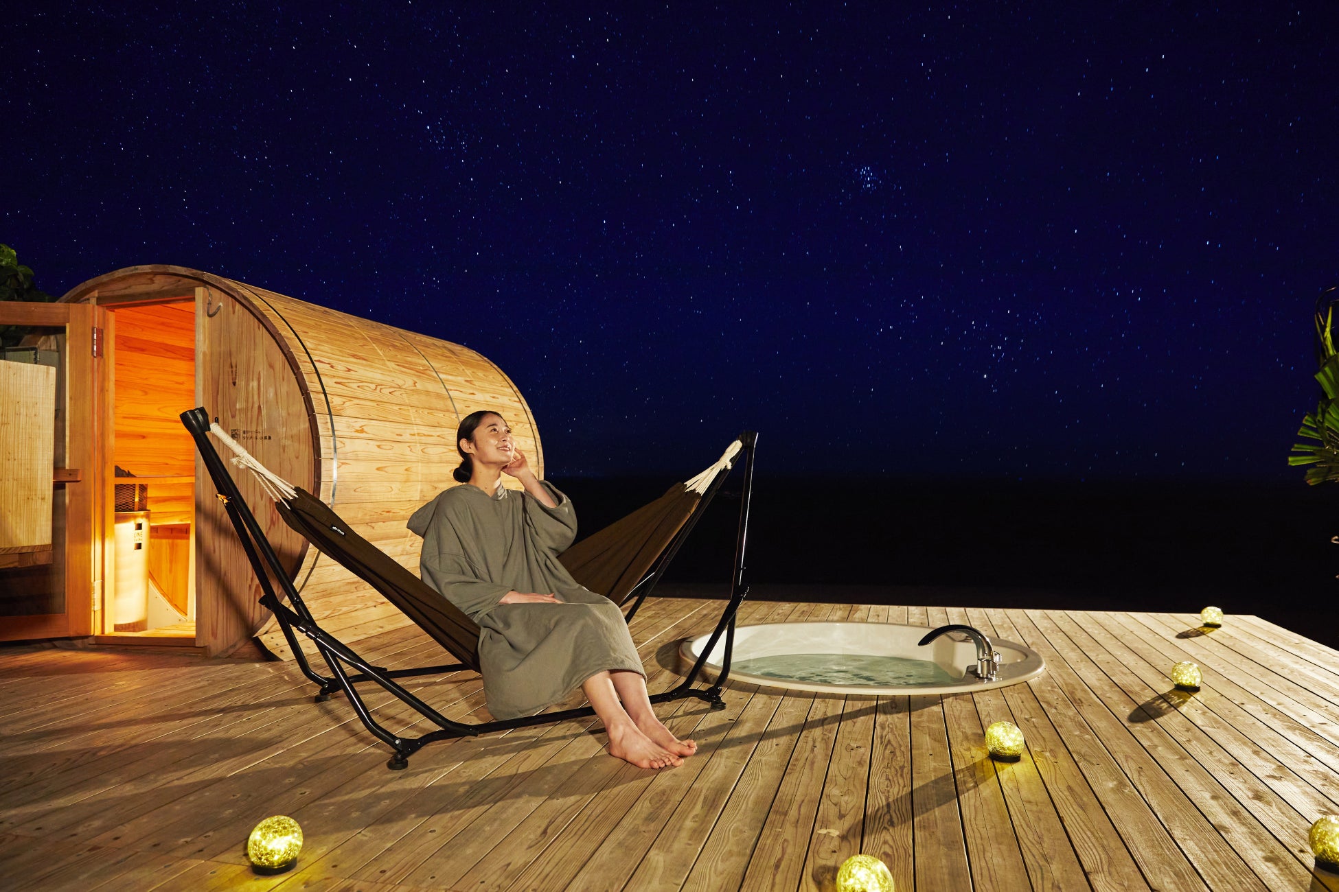 サウナで身体を温めた後は、夏の夜空にかかる壮大なティンガーラを眺めながら身体をととのえます。満天の星の下、波の音を聴きながら水風呂に入った後は、同スペースに用意されたハンモックで天の川を仰ぎながら外気浴を満喫。静かな夜のビーチに、心地よく吹く海風にあたりながら、ゆっくりとととのうことができる空間です。