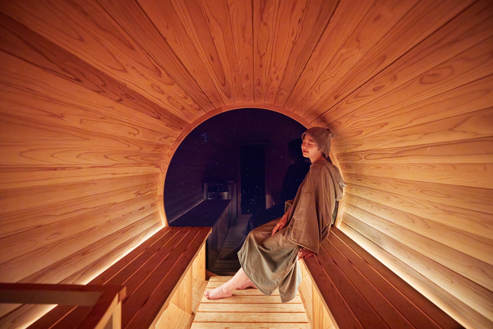 ホテルに隣接するビーチに佇むバレルサウナの内部が期間限定でライトアップされ、幻想的な明かりに包まれます。バレルサウナに配された大きな窓から覗く夜の静かなビーチを眺めながら、セルフロウリュを備えた本格的なサウナを体験。幻想的な空間でゆっくりと身体を温めます。