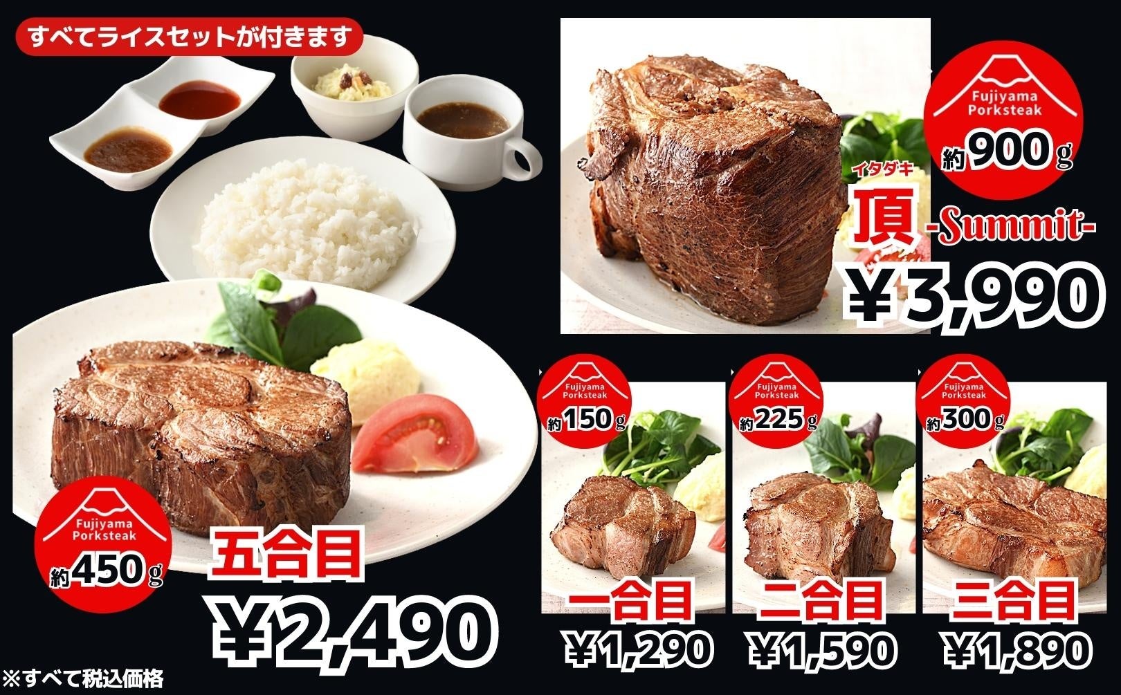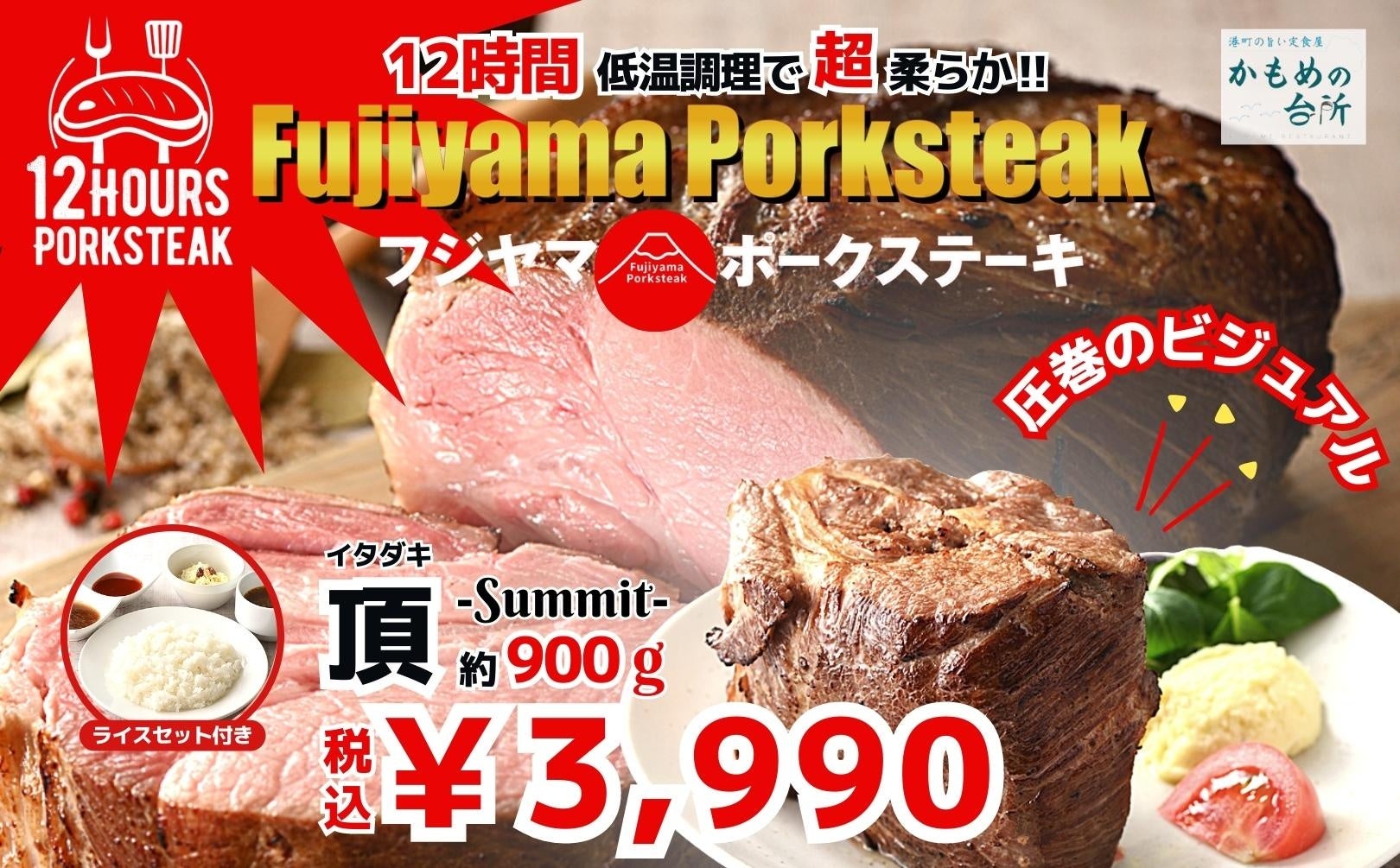 【巨大!ポークステーキ登場!】ネオパーサ駿河湾沼津『かもめの台所』にて、強烈なボリューム感と圧巻のビジュアル!低温調理でしっとり柔らか『フジヤマポークステーキ』が新登場!富士山級の『頂』をご堪能あれ!