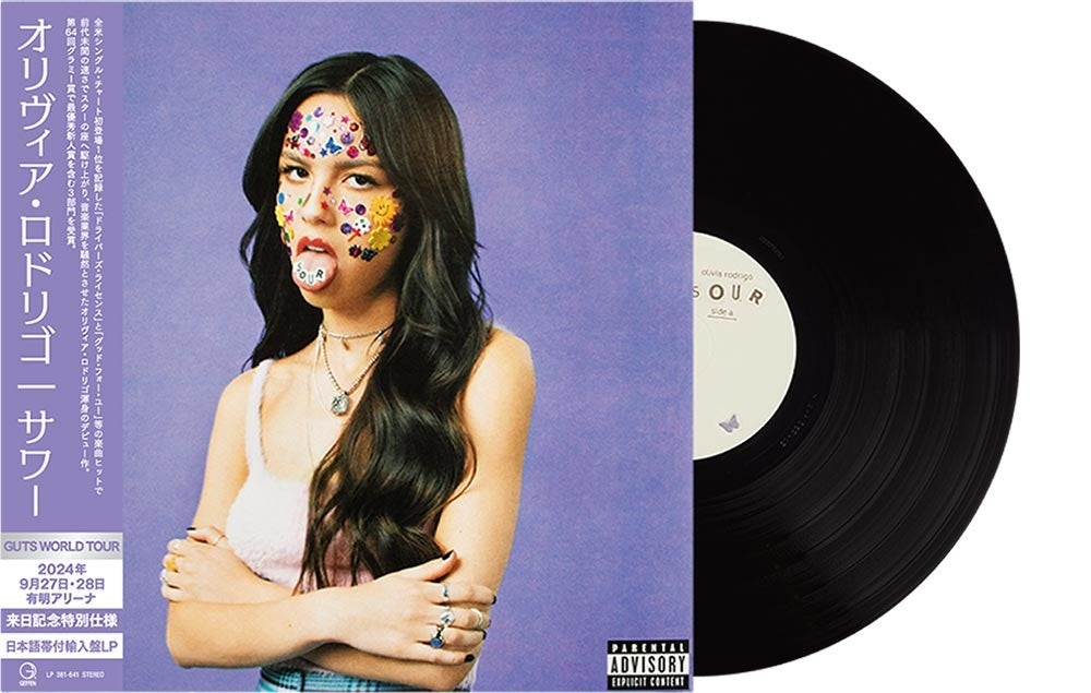 2021年発売のデビュー作『SOUR』の帯付きアナログレコードも発売。世界的な大ヒットとなった「drivers license」収録。