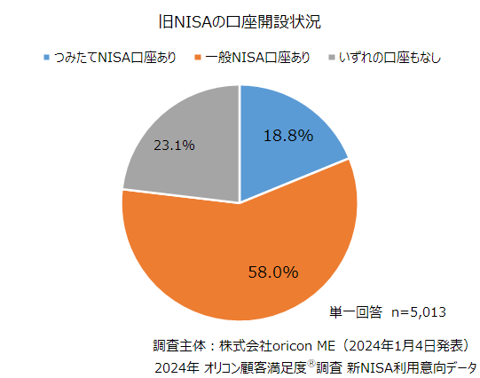 ネット証券利用者5,013人のうち、旧NISAの「つみたてNISA」の口座を開設している人は18.8%、「一般NISA」は58.0%、いずれの口座もない人は23.1%となりました。