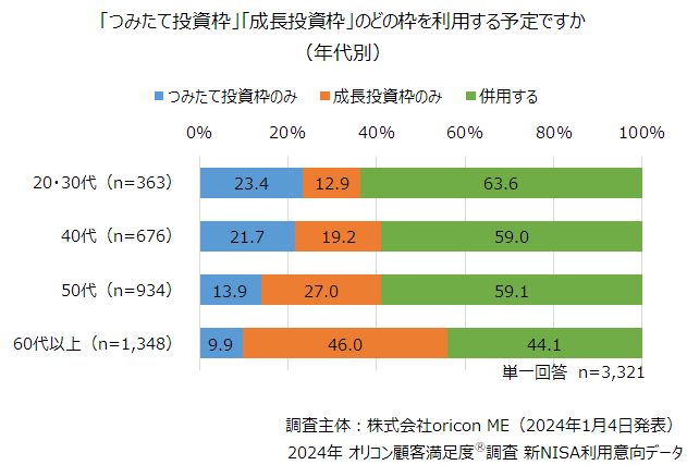 20~40代では20.0%以上が「つみたて投資枠のみ」、60代以上では46.0%が「成長投資枠のみ」