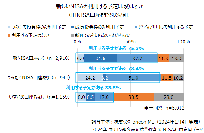 旧NISAの口座開設状況ごとに、新NISAの利用意向をみると、いずれかの口座をもつ人の70%以上が新NISAも利用する意向を示しているのに対し、いずれの口座も持たない人の利用意向は33.5%に留まりました。
